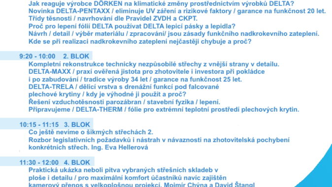 Praktická ukázka neboli pitva vybraných střešních skladeb v ploše i detailu / pro maximální komfort účastníků navíc zajištěn kamerový přenos s velkoplošnou projekcí.