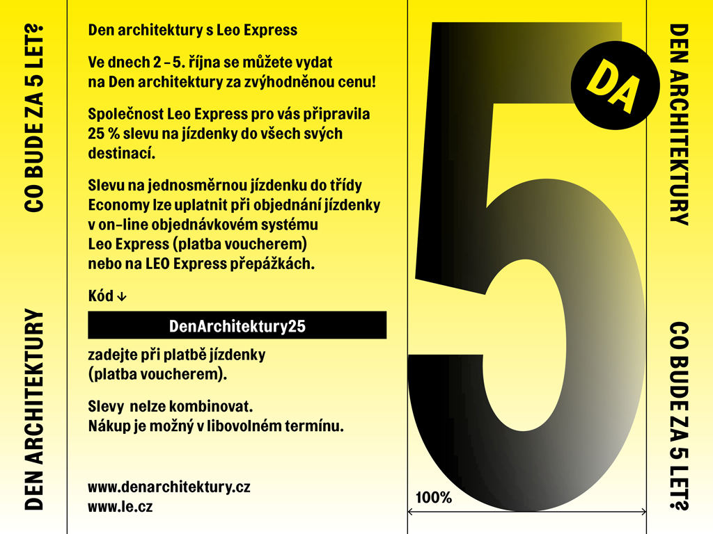 Na Den architektury s Leo Express: Ve dnech 2.- 5.10. se můžete vydat na Den architektury za zvýhodněnou cenu. Společnost Leo Express pro vás připravila 25% slevu na jízdenky do všech svých destinací.