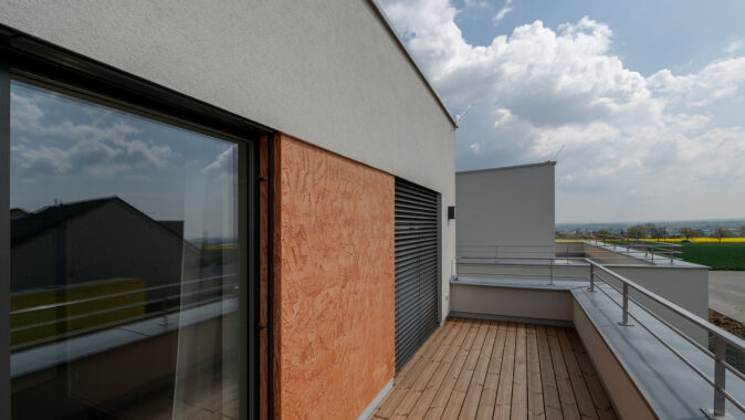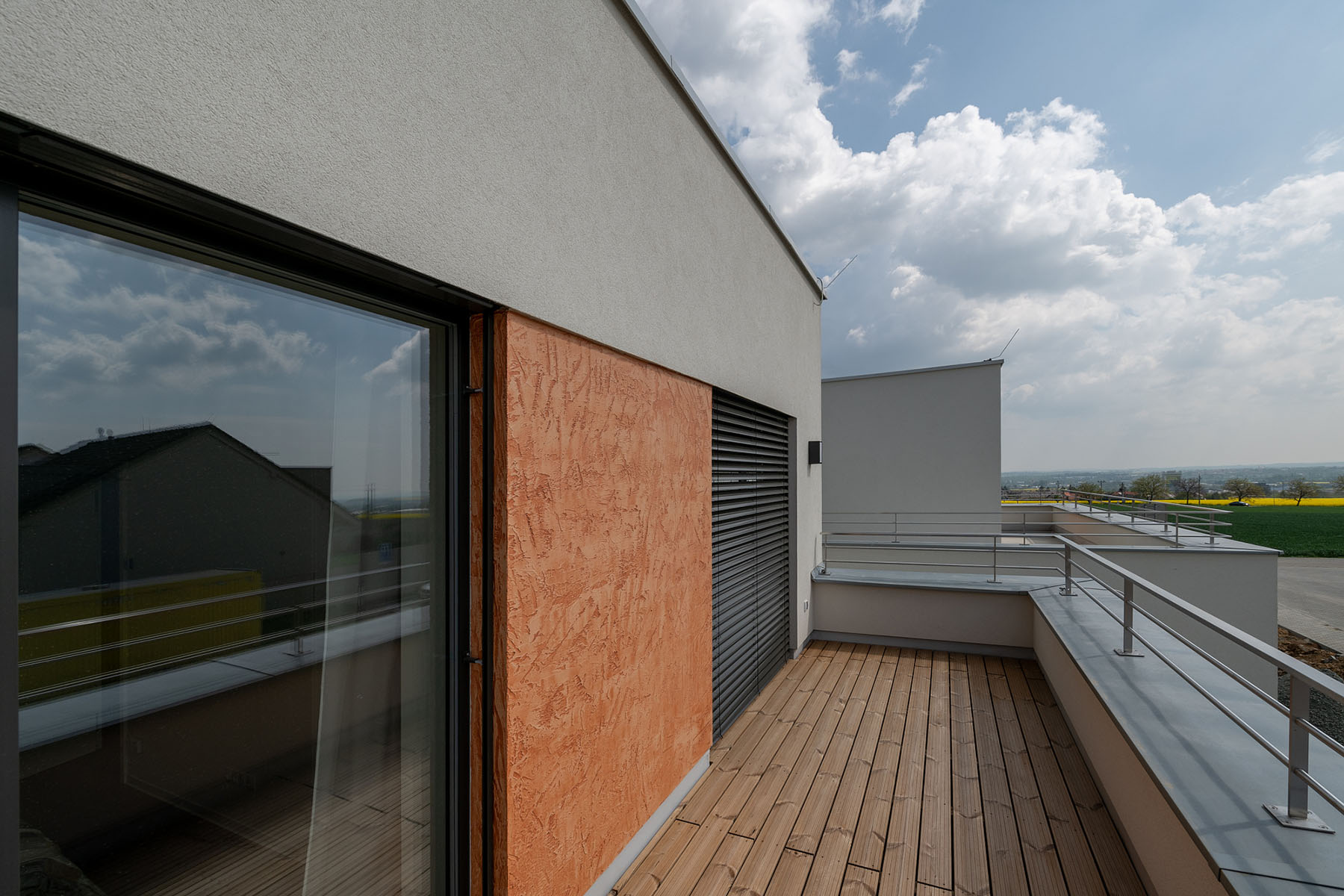 Dvoupodlažní vily byly navrženy s dispozicemi 5+kk. Ze vstupní haly v přízemí vstoupíte do hlavního obytného prostoru zahrnujícího obývací pokoj, kuchyňský i jídelní kout, dále pak do pokoje pro hosty, koupelny i dvojgaráže. Dále se zde nachází otevřené schodiště, které Vás zavede do patra se dvěma dětskými pokoji, technickou místností, koupelnou s toaletou, šatnou a ložnicí propojenou s druhou koupelnou. Z ložnice lze vyjít na prostornou terasu, která vznikla díky tomu, že vrchní podlaží půdorysně ustupuje. Svoji polohou nabídnou domy krásné výhledy přes krajinotvornou zeleň na jihozápadní část města Brna a nebudou ani v budoucnu narušeny díky stavební uzávěře končící právě na hranici pozemku.