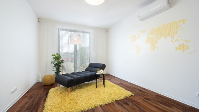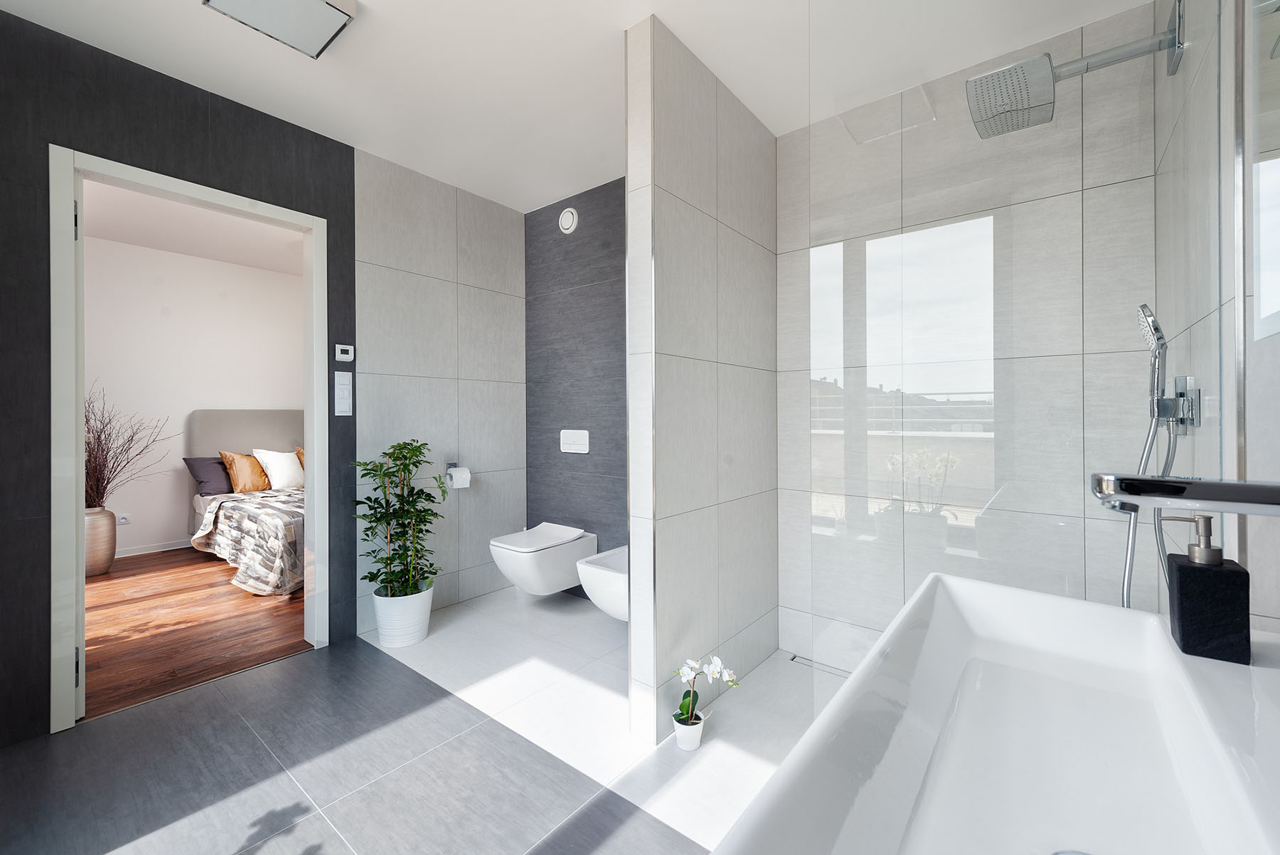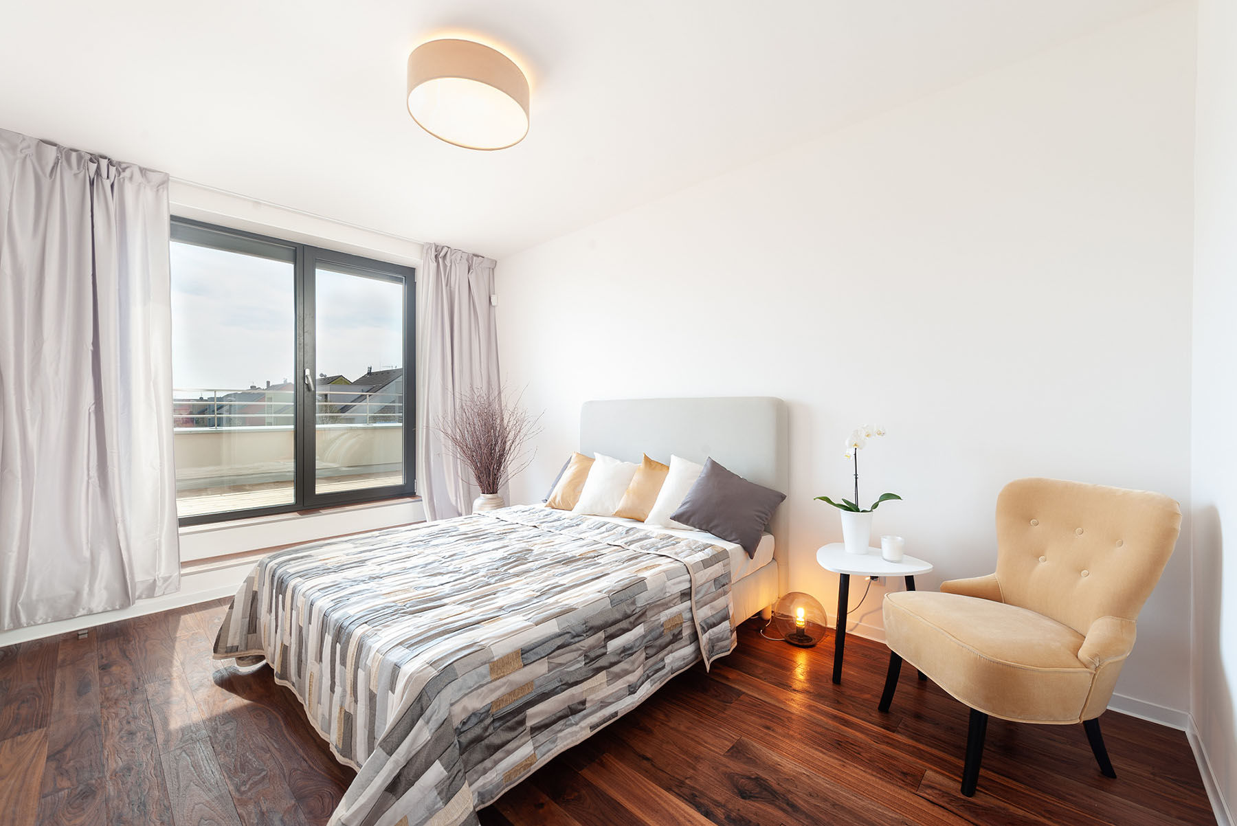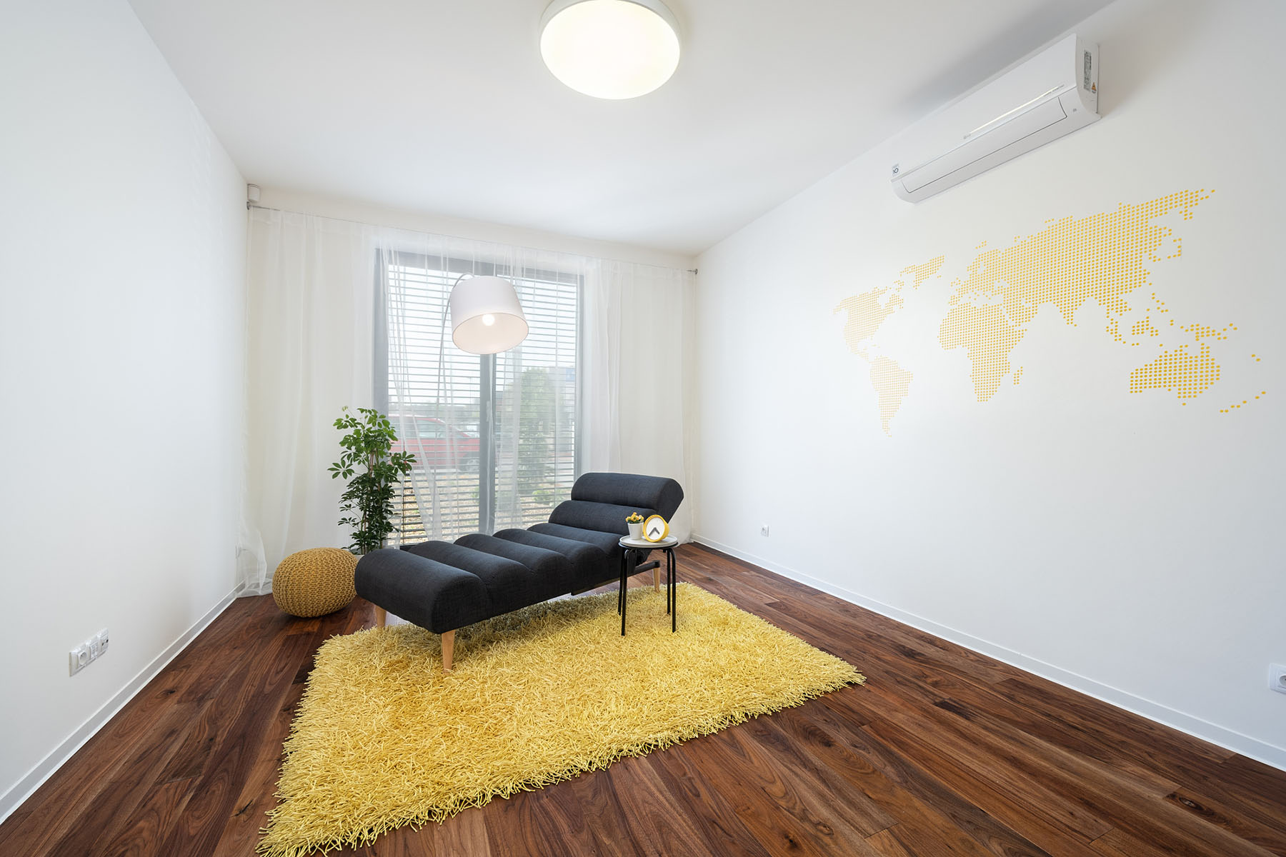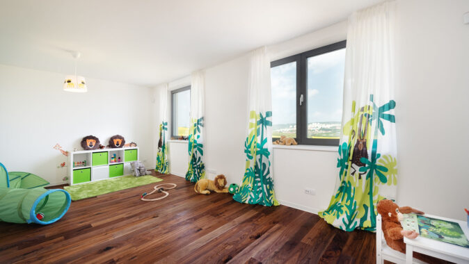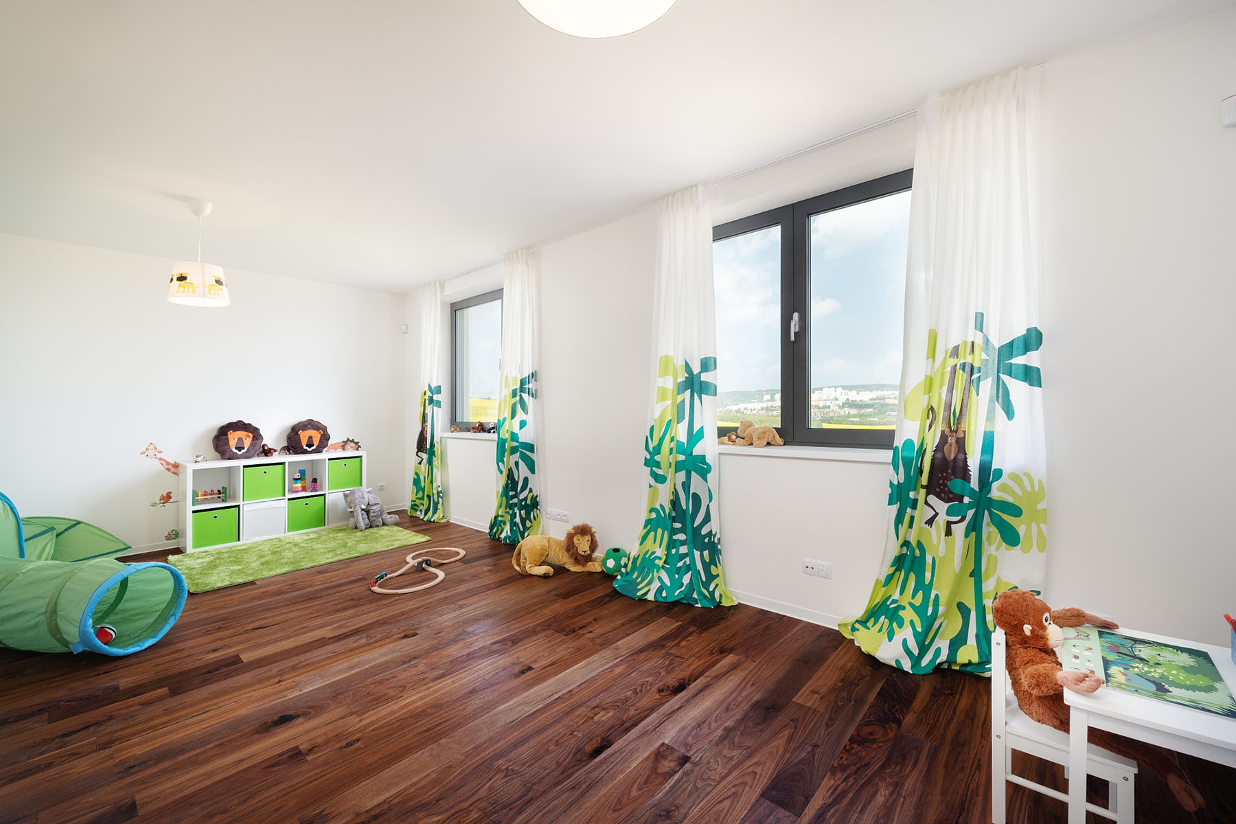 Kromě koupelen a vstupní haly zvolil architekt pro všechny obytné prostory dřevěné lamely švédského výrobce Kährs, které k nám dováží společnost KPP. Ve standardu developera jsou na výběr tři dekory z kolekce Kährs Linnea Lodge, světlý Dub Tide, klasicky hnědý Dub Breeze a temnější Ořech Bloom. Jedná se o tradiční 2-lamelové provedení (1225 x 193 x 7 mm) lakovaných třívrstvých dřevěných podlah s klidným dekorem téměř bez suků, které jsou pokládány na zámek.