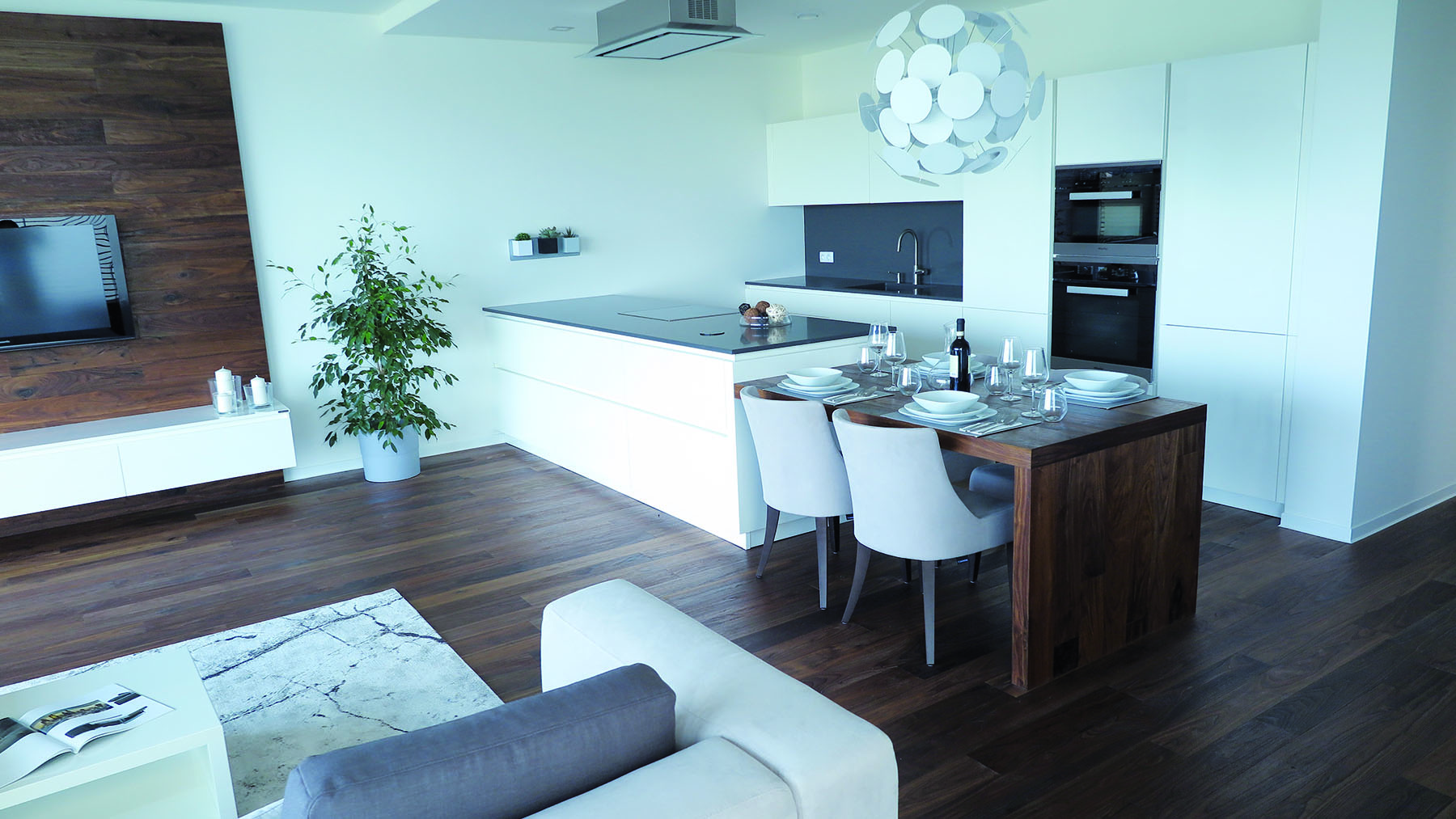 Podlahy, kam se podíváš. Takovou inspiraci uvidí klienti ve vzorovém domě právě dokončovaného projektu Vily Švédské kříže v Moravanech u Brna. Dřevěné podlahy švédské značky Kährs dodávané společností Kratochvíl parket profi nejenže vystoupají z přízemí po schodech do prvního patra, ale v obývacím pokoji se vytáhnou i na televizní stěnu a konečně lze na nich i poobědvat, protože z nich truhlář vyrobil jídelní stůl. O jednotu a soulad barev a materiálů v interiérech se starají i dveře a zárubně sladěné s kuchyňskou linkou, nábytkem a skříňkami navrženými designéry studia Hanák centrum v bílé barvě s lehkým nádechem vanilky.