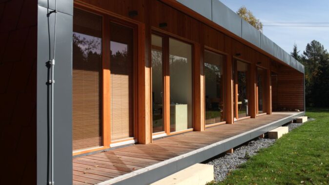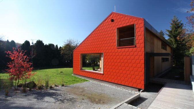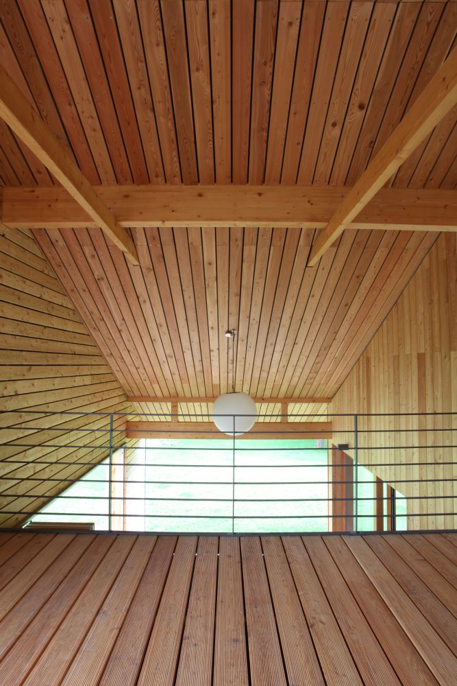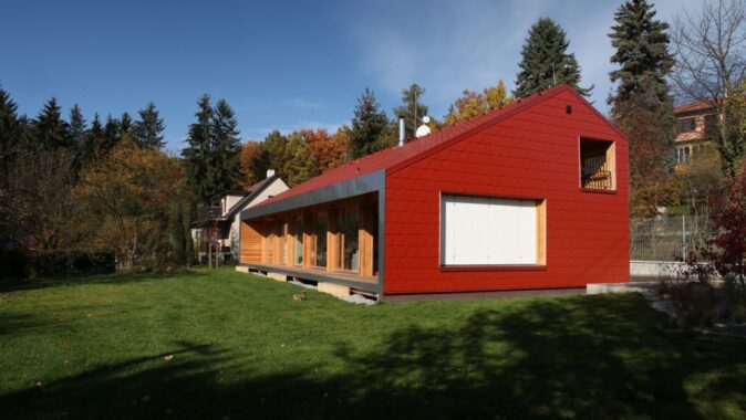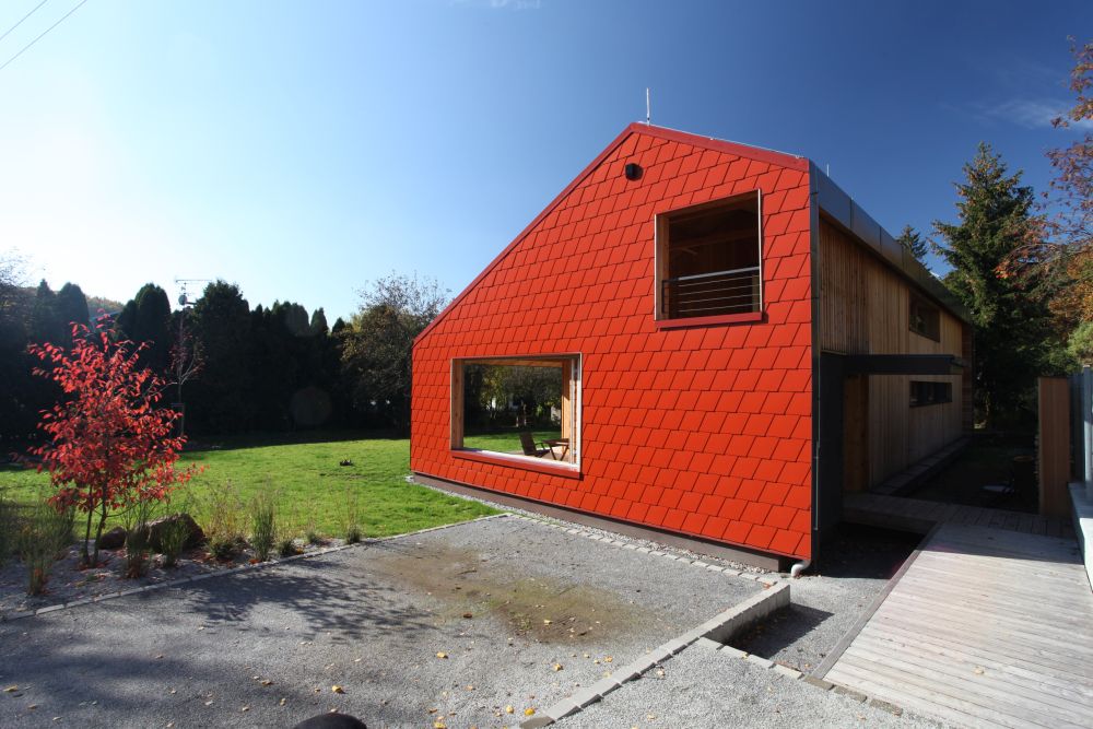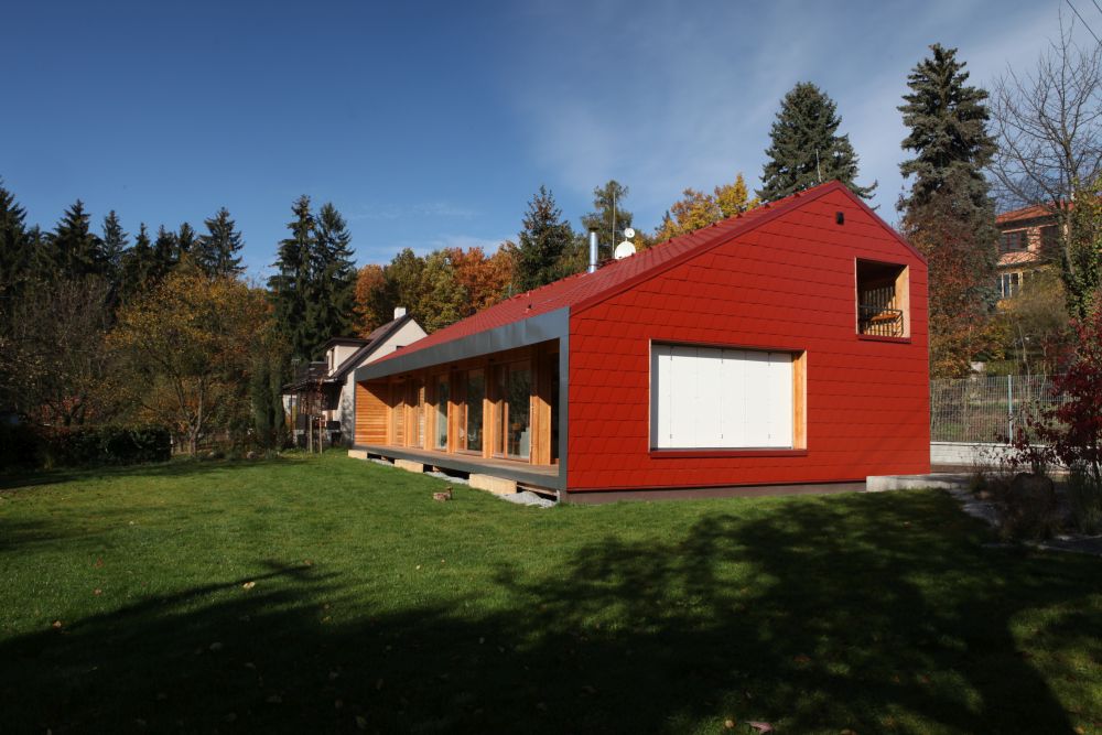 Tento rodinný dům byl původně koncipován jako přízemní. Měl totiž sloužit staršímu manželskému páru, který se chtěl přestěhovat z centra velkoměsta. Nakonec v reakci na místní regulativy přikazující tvar a barvu střechy vznikl koncept stavby, kdy pod střechou vznikla jakási druhá úroveň, která se propisuje až do prostoru zastřešené terasy, která je stejně jako hlavní obytný prostor dvoupatrová.