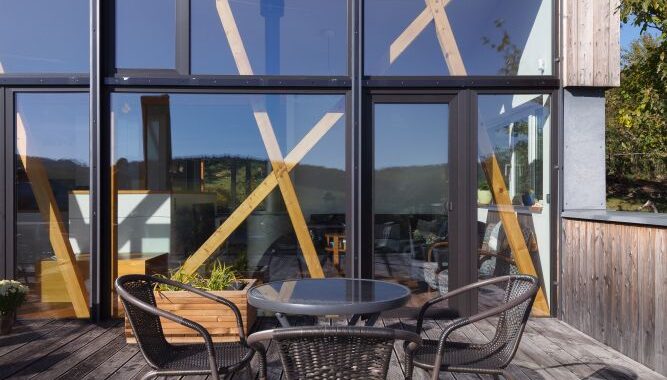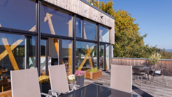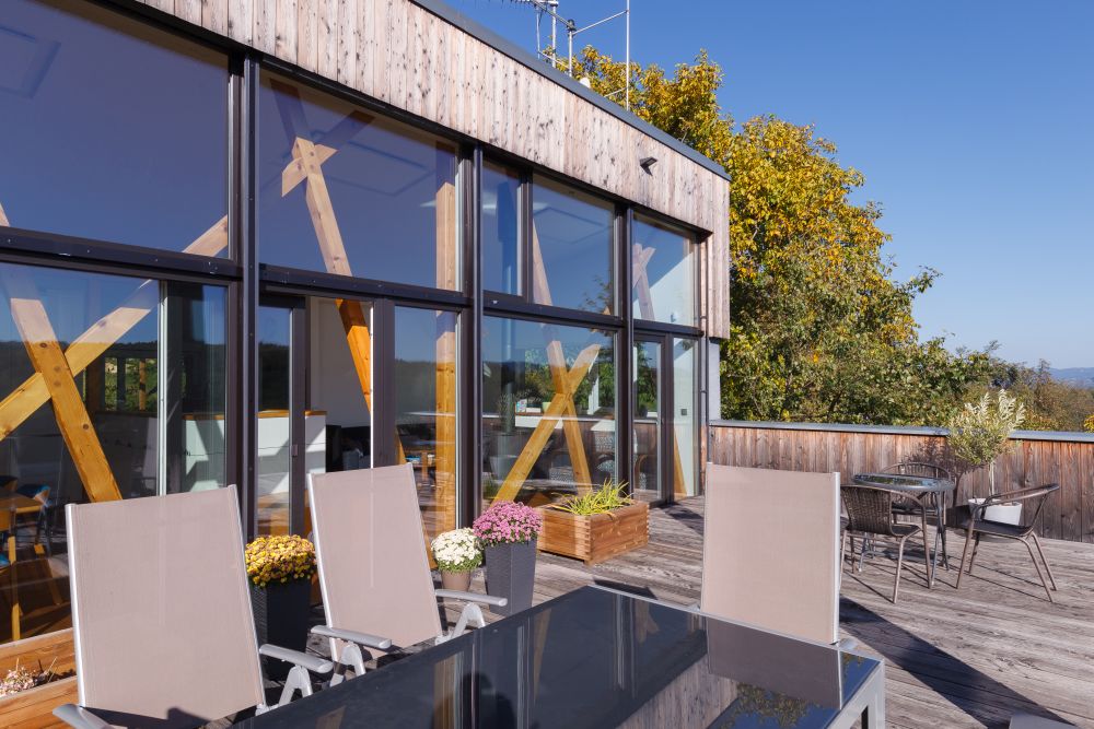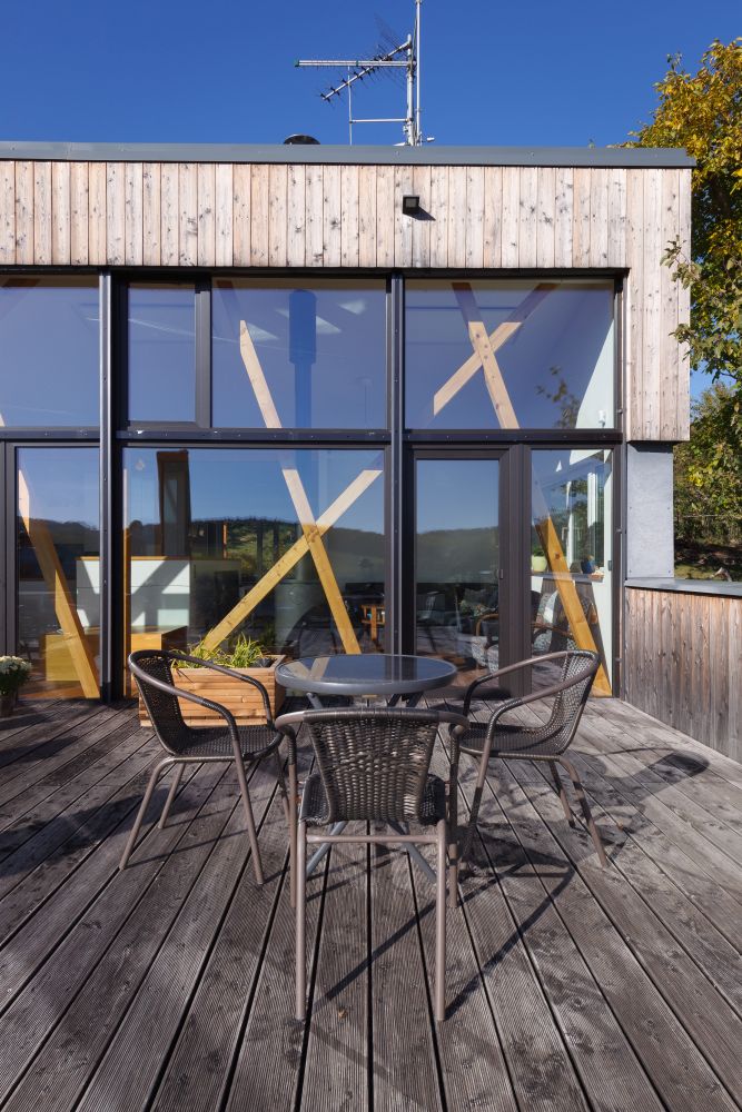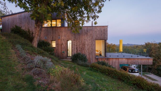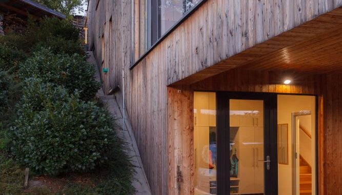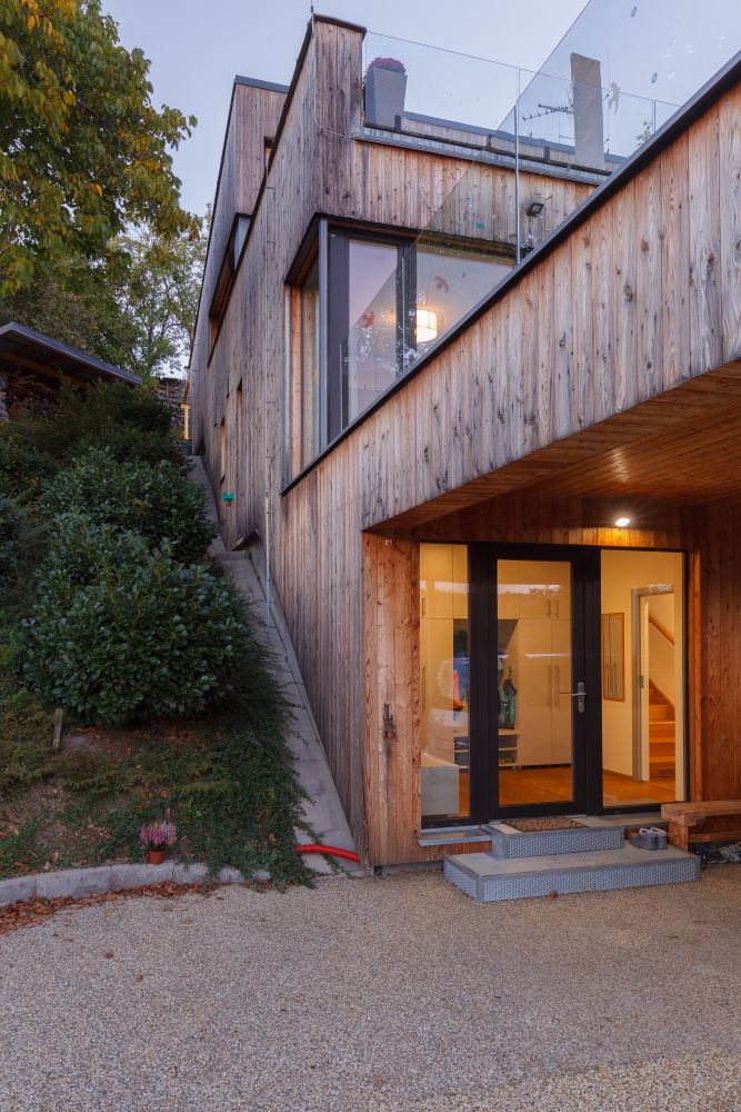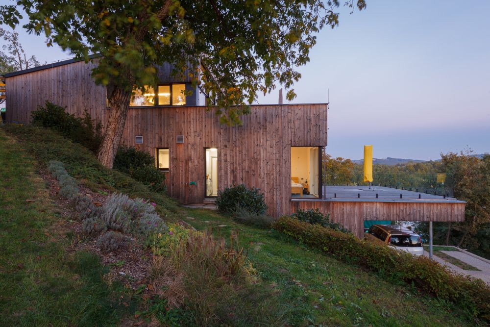 Pozemek se nachází na poměrně strmém jižním svahu s panoramatickými výhledy do údolí. V návrhu jsme respektovali vzrostlé stromy, jejichž koruny rámují stavbu a výhledy z ní. Hmota domu reaguje na terén – vznikl tak terasovitý koncept v třech výškových úrovních. Jižní fasády jsou velkoryse proskleny, vnitřní prostory jsou rozšířeny o terasy.