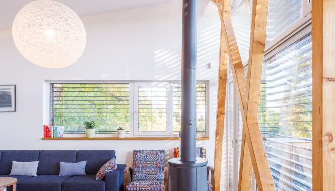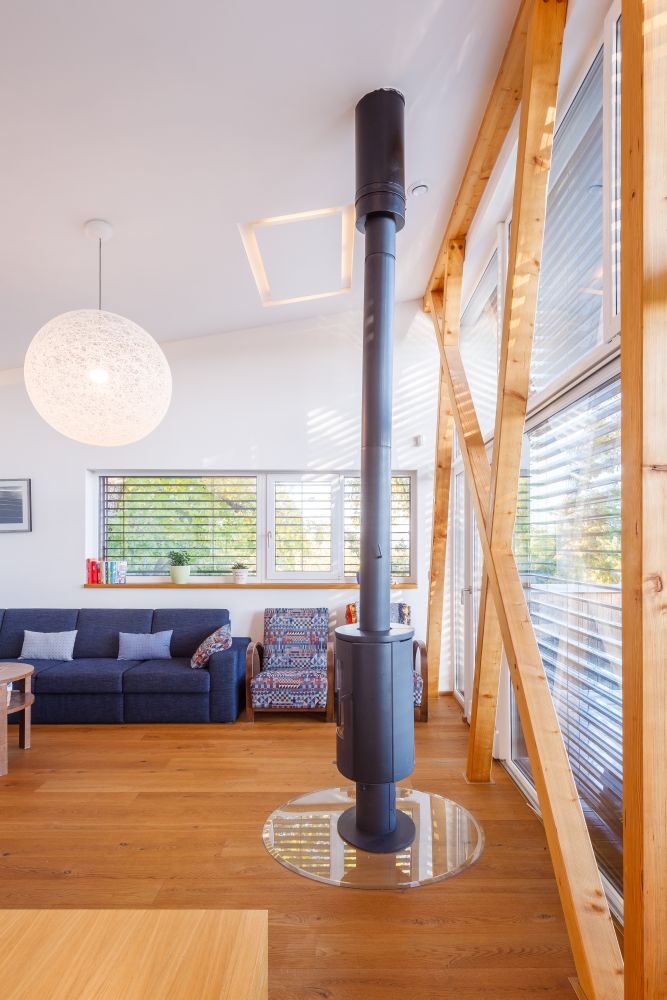 Na nejnižším vstupním podlaží je umístěno zádveří a sklad, přesah střechy tady vytváří kryté stání pro auta. Přímé schodiště prochází všemi úrovněmi domu. Střední podlaží, odkud je přímý výstup na terén, představuje klidovou část s dětskými pokoji, ložnicí rodičů a s odpovídajícím hygienickým zázemím. Na nejvyšší úrovni domu se nalézá denní část – kuchyně spojená s jídelnou a obývacím prostorem. Dispozici podlaží doplňují pokoj pro hosty, koupelna, komora a zadní terasa se vstupem do domu z nejvyšší úrovně terénu a zahrady. Interiér s dubovými podlahami a bílými povrchy stěn ve všech místnostech působí vzdušně a prostorně díky subtilnímu zařízení ve světlých odstínech a přirozenému světlu. Vytápění zabezpečuje elektrické topení v kombinaci s krbovými kamny.