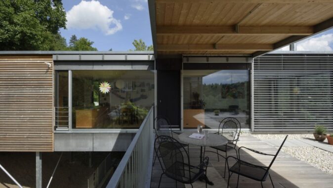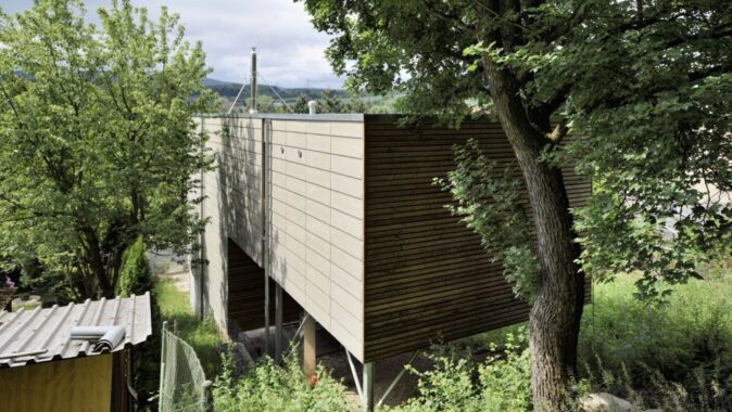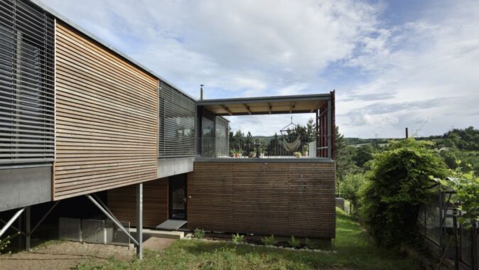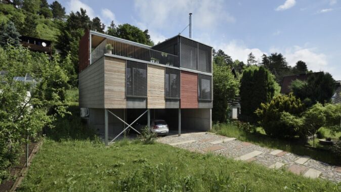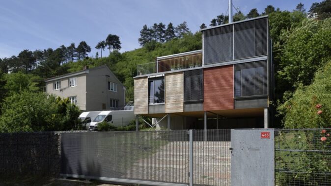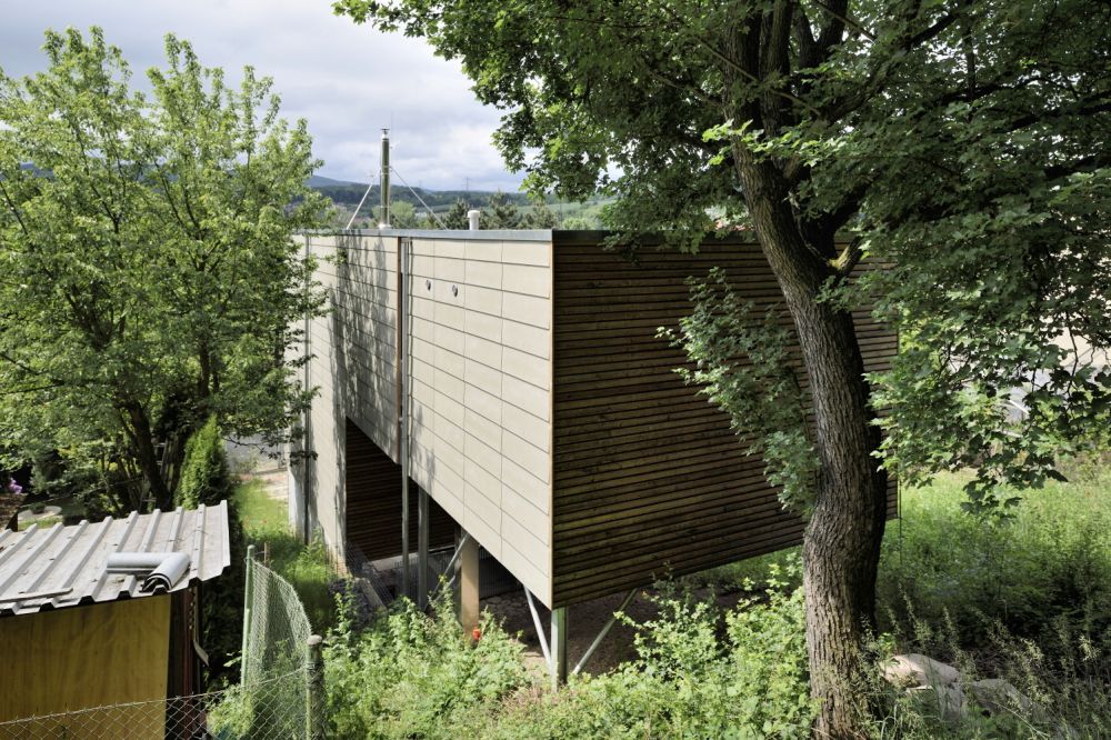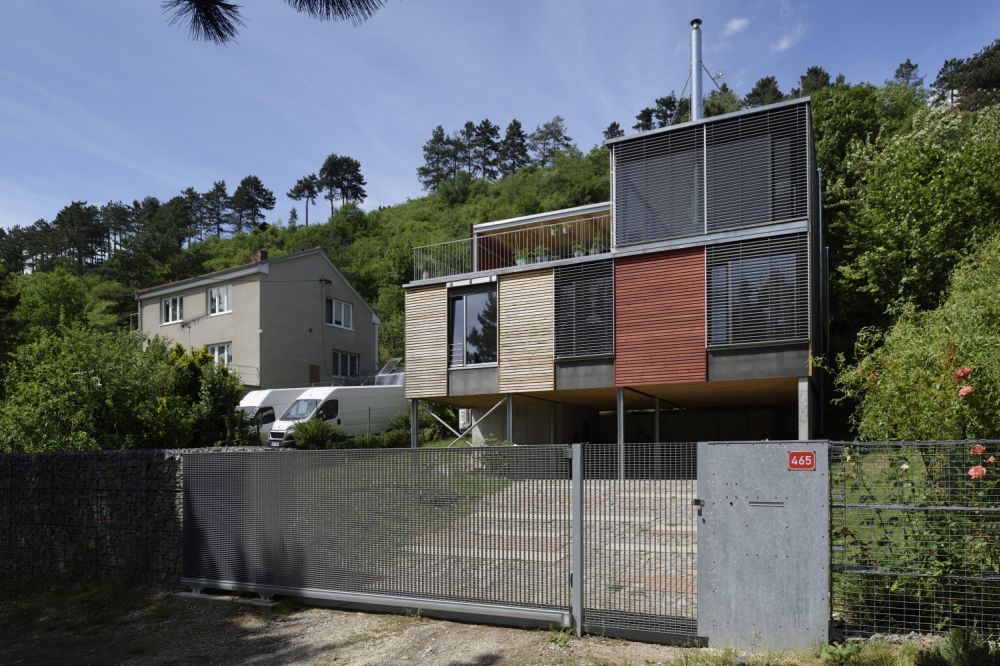 Pozemek na konci slepé ulice v chatové oblasti je úzký a stoupá prudce vzhůru po jižním úbočí říční terasy. Nad zářezem pro parkování jsou posazena dvě obytná podlaží. Jejich objemy se nikde nedotýkají terénu a půdorysně svírají úhel 90°. Nad částí prvního podlaží s ložnicemi tak vzniká plocha pro střešní terasu u hlavního obytného prostoru ve druhém podlaží.