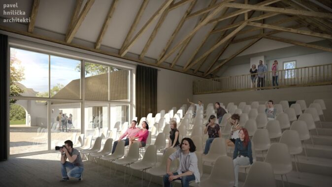 Stavba zachovává urbanistický koncept venkovského dvora, obestavěného ze tří stran, s využitím stávající brány z jižní strany. Budova se otevírá do dvora, který je středem celého areálu. Měl by se stát místem setkávání, případně by se tu mohly rozšířit aktivity ze sálu. Divadlo má všestranné využití pro kulturní, obecní a občanské aktivity i pro rozšířenou školní výuku.