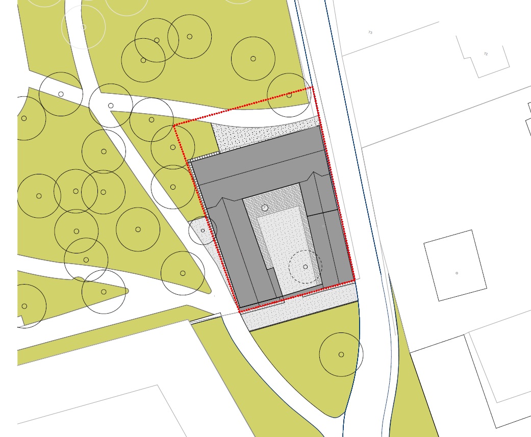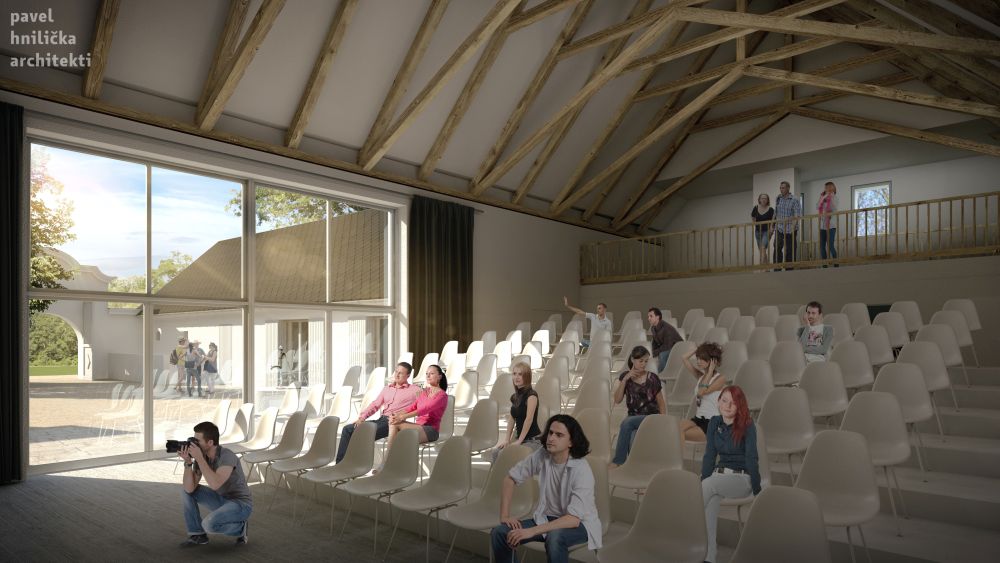 přes dvůr. Náš návrh doplňuje severní trakt se sálem, jeho zázemím, sklady a