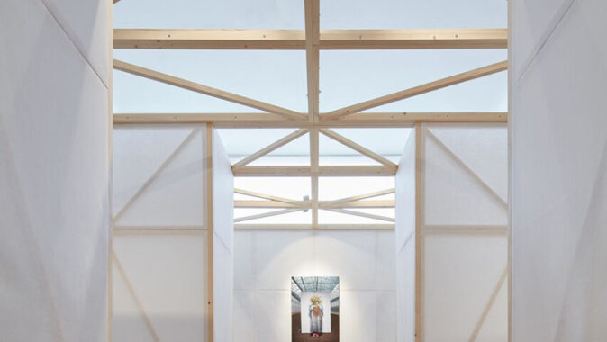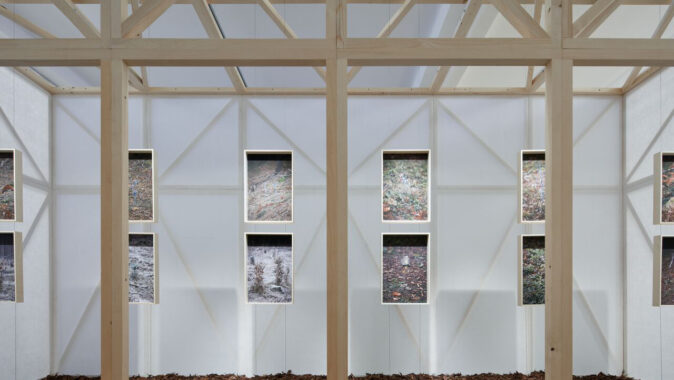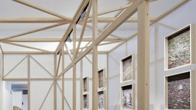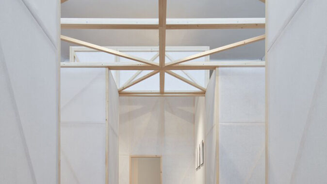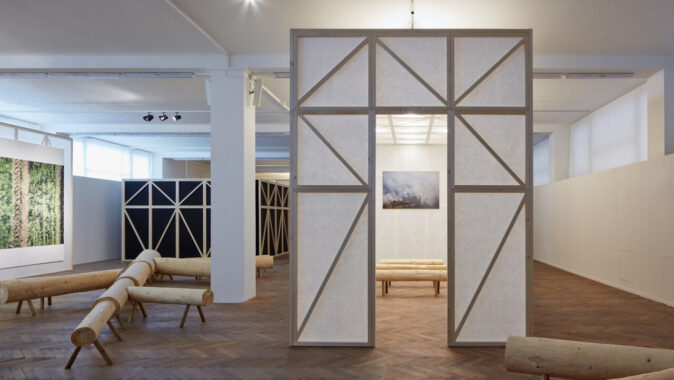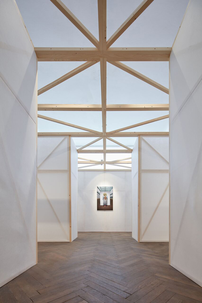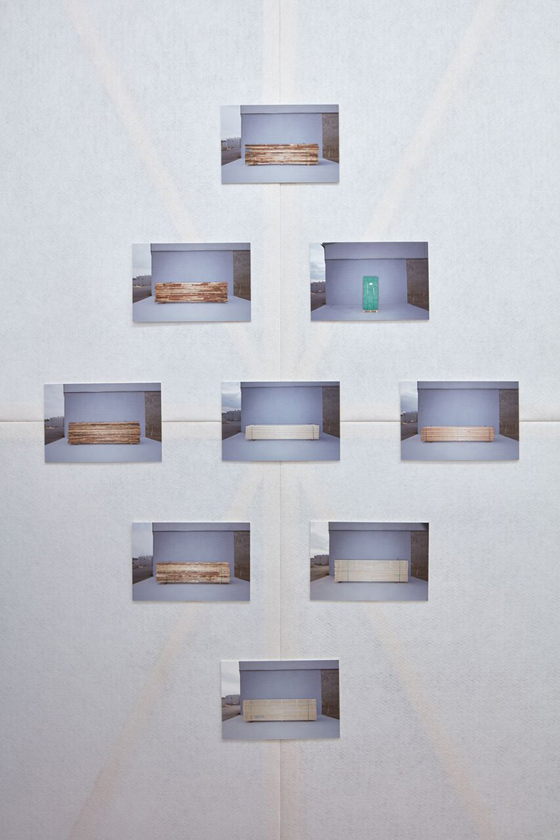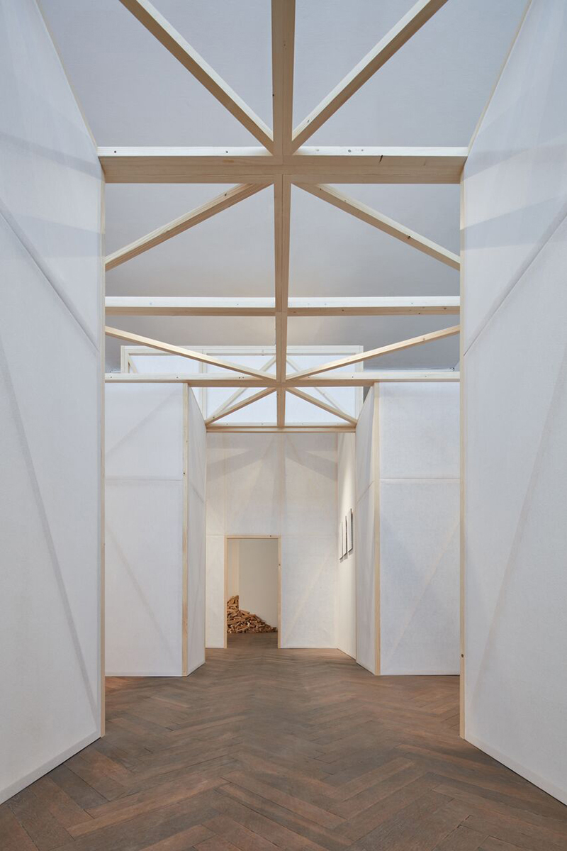 Instalace složená z panelů rozbíjí výstavní prostor do urbanizovaného prostředí. Dřevěná konstrukce panelů se rytmicky opakuje a dává výstavnímu sálu měřítko.