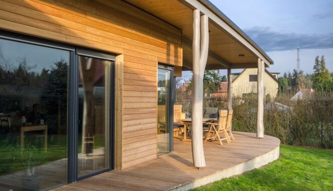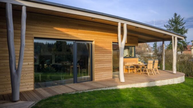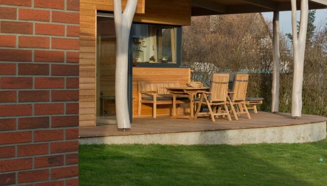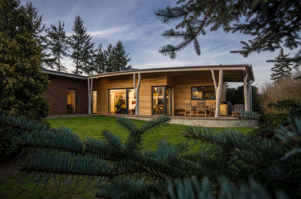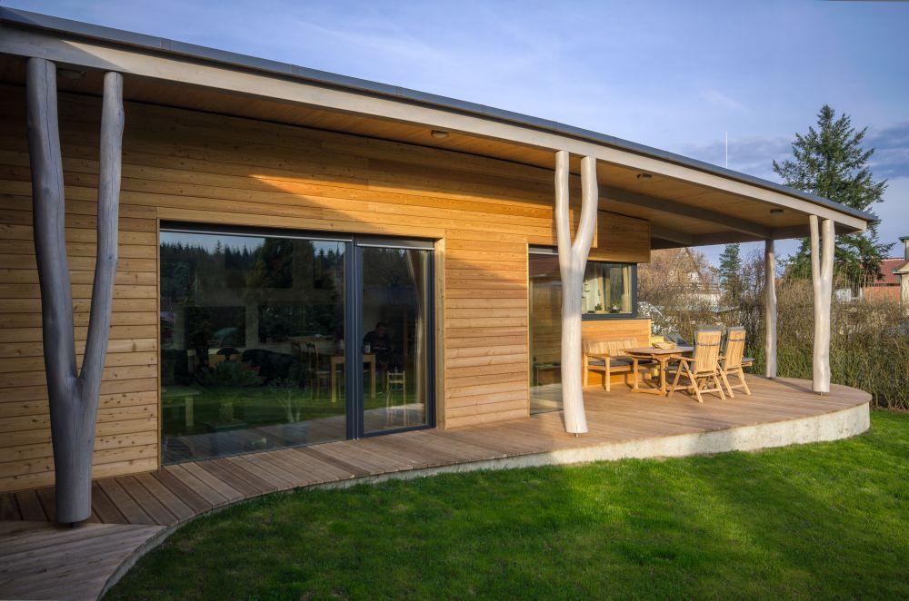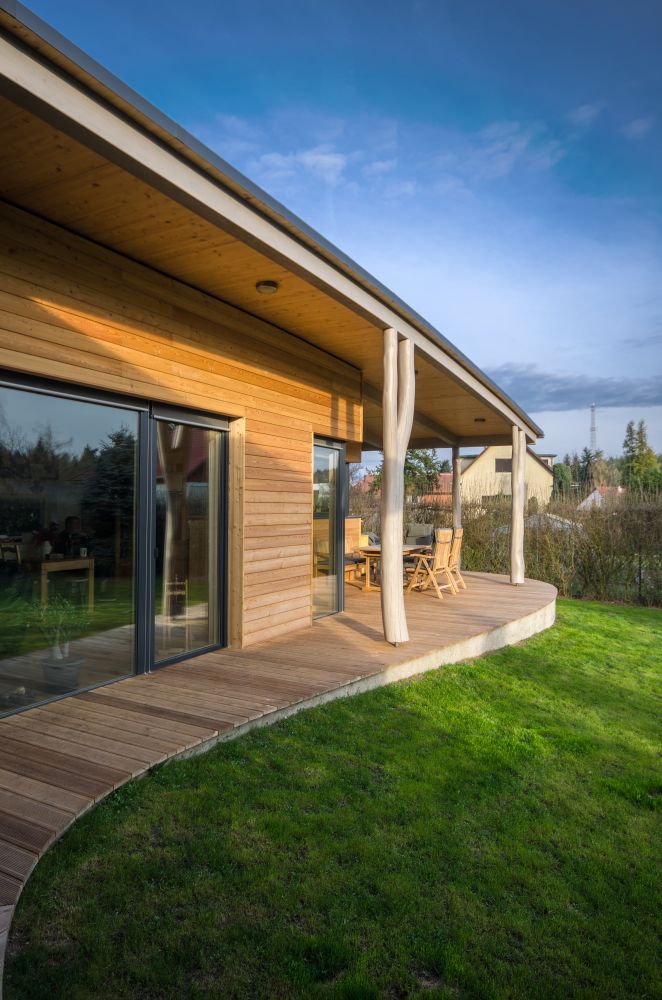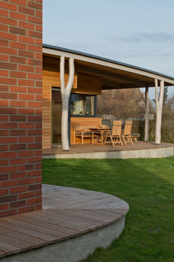 východní straně pozemku přesah kryje terasu, na západní vytváří přístřešek pro