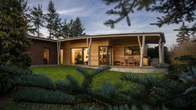 osobní automobily se zelenou střechou. Výška hřebene je 3,65 m. Střechu domu