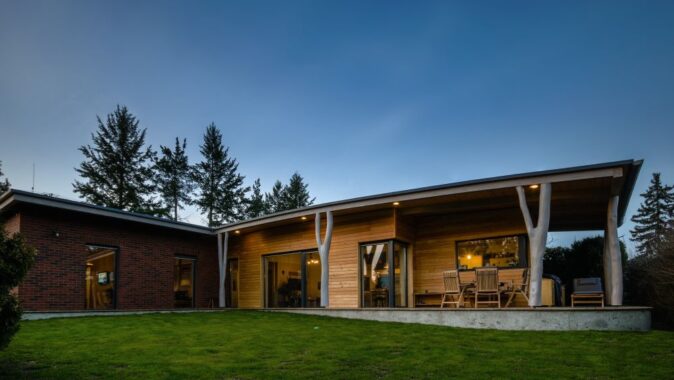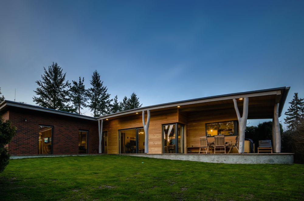 Jednoduchý přízemní dům má půdorysný tvar písmene L, obě