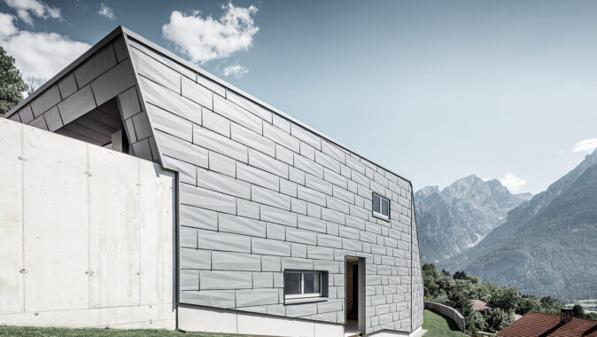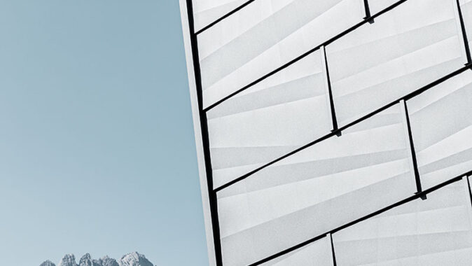 prosklenou stěnou, zajímavě řešenou střechou a fasádou odrážející světlo.