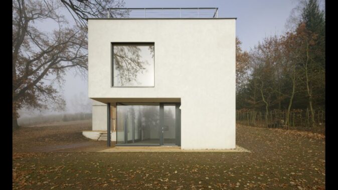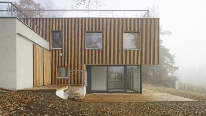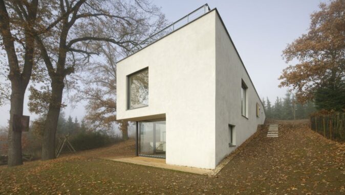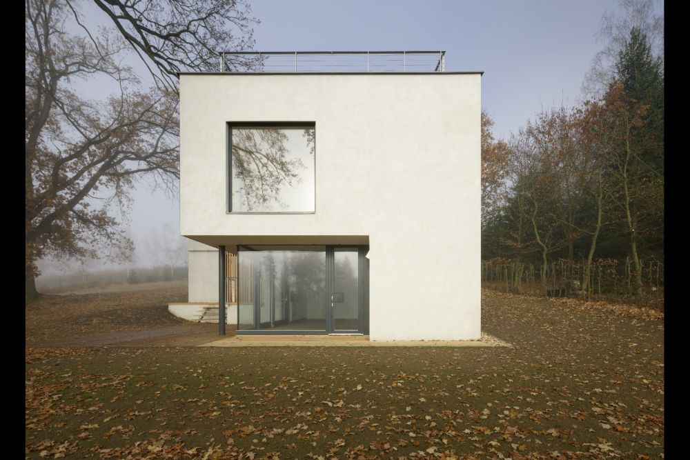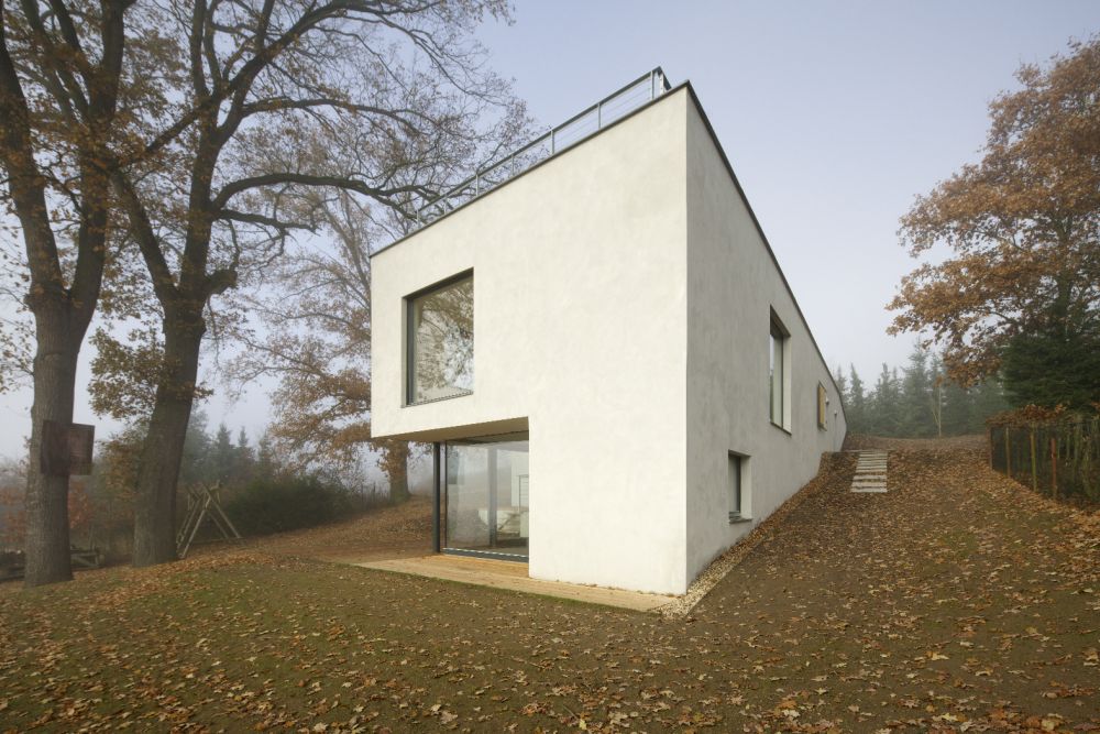 Umístění domu vychází z tvaru terénu a z přístupnosti pozemku ze severní strany. Je ale určeno zejména polohou stromů. Stavba využívá kvality prostředí, které vzrostlé stromy vytvářejí, také výhled na krajinu a na horizont je v této výškové úrovni nejhezčí. V jižní polovině plochy pozemku zůstává louka.