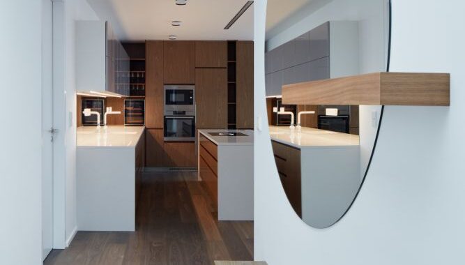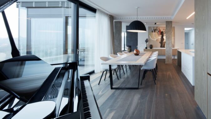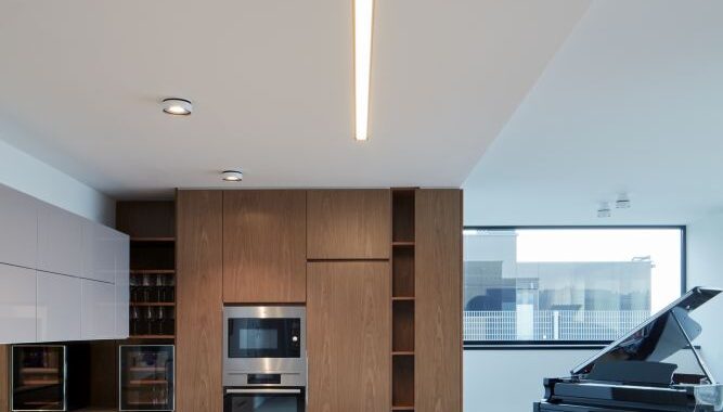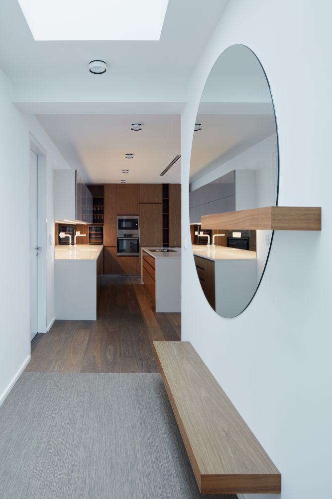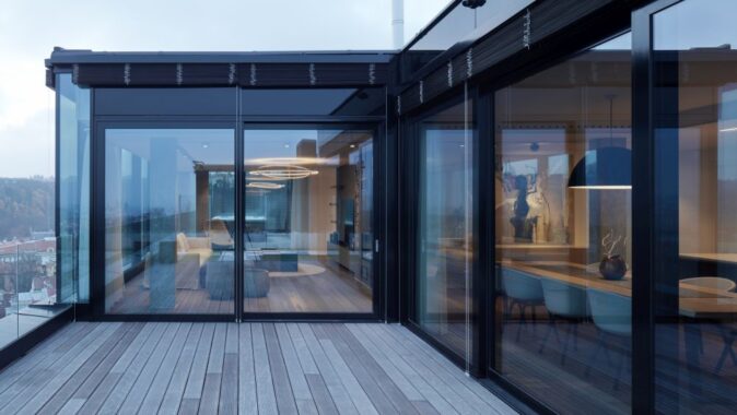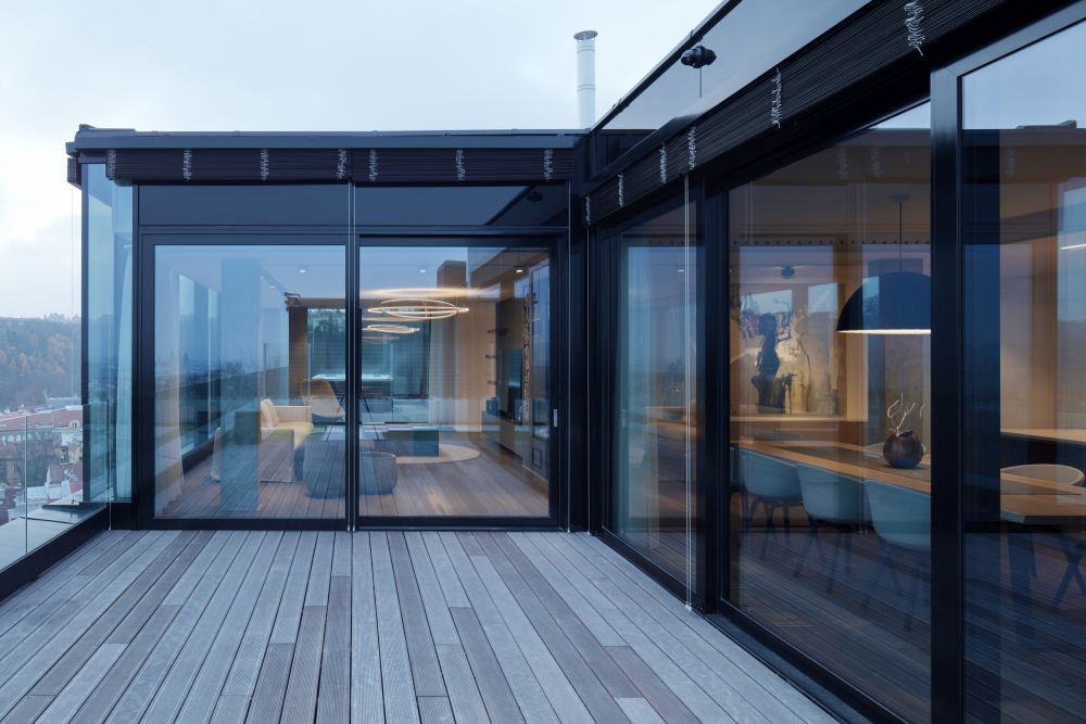 Hlavním benefitem bytu jsou nádherné výhledy a fasáda, která dá těmto výhledům vyniknout díky velké ploše prosklení. Město jakoby vniká do interiéru, proto byla dispozice obytné části navržena s maximálním důrazem na otevřenost. Hned od vstupních dveří tak vznikají překvapivé průhledy. Velké prosklené plochy fasády ale zároveň přinášejí problém s přehříváním v letních měsících. Tomu je zabráněno pomocí systému chlazení, který perforací v podhledu podél celé fasády nechá padat pomalý proud studeného vzduchu. Interiér tak není rušen mřížkami a zároveň ani hlukem chladicích jednotek.