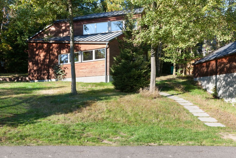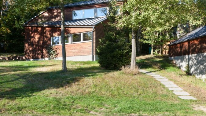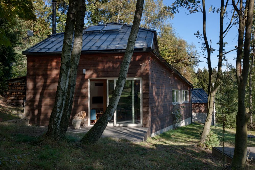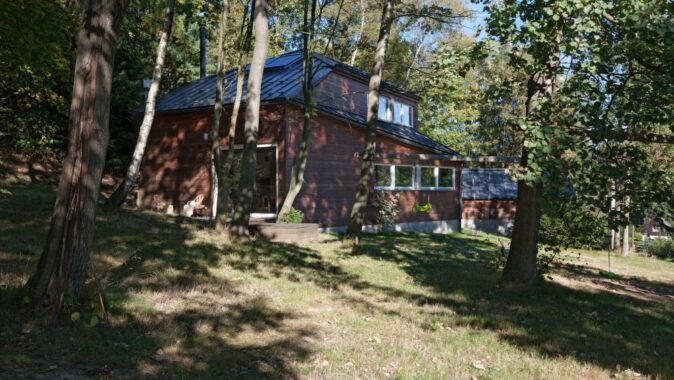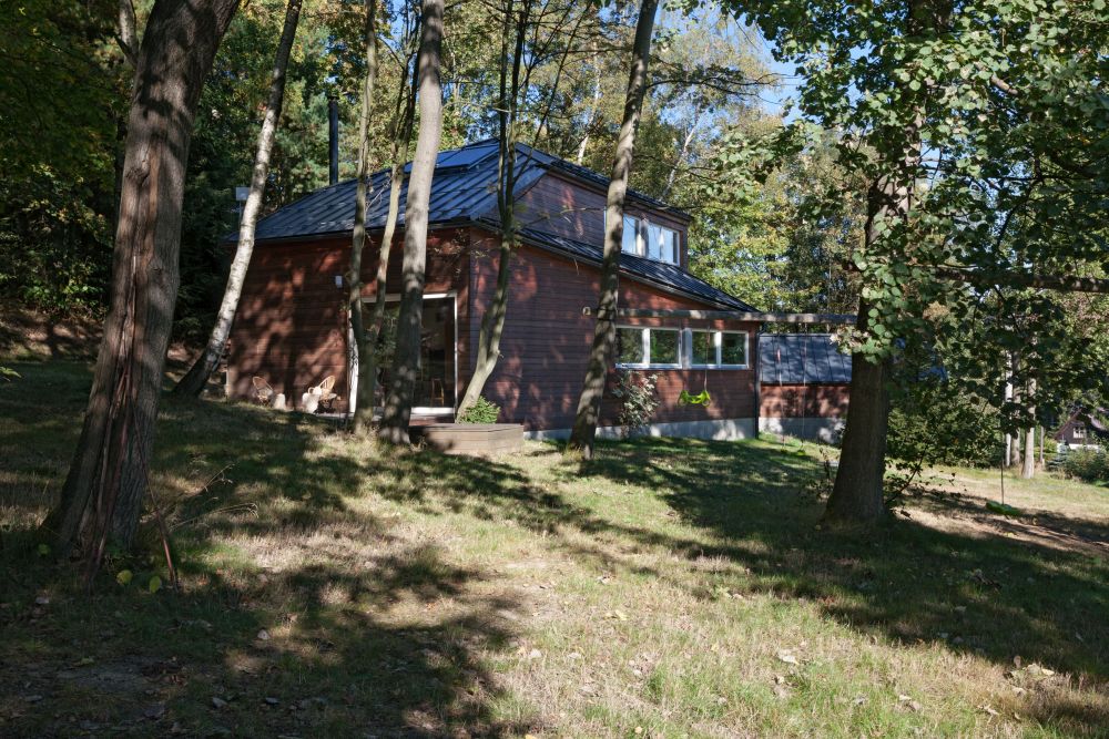 výhledy z různě půdorysně natočených oken. Čistá dřevostavba má v interiéru