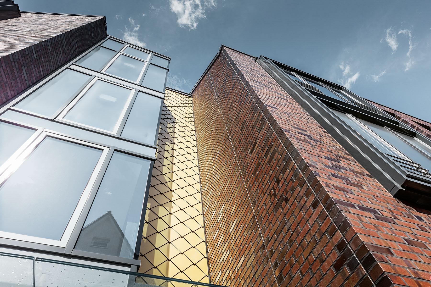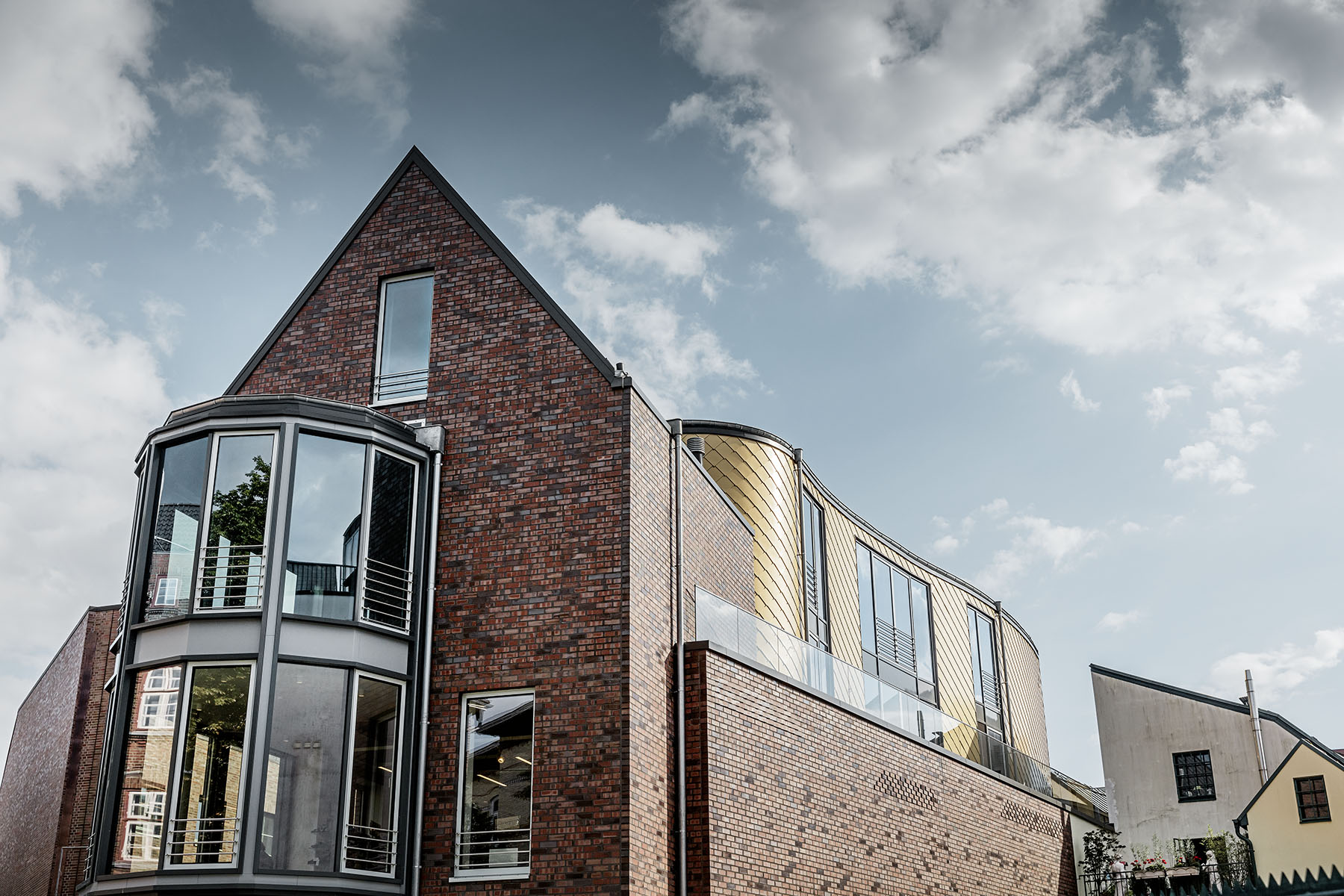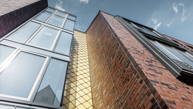 V okrajové části Hamburku představuje Dům obuvi Schüttfort své nové obchodní a kancelářské prostory. Jedná se o zcela nové pojetí klasického cihlového domu, se zlatými šablonami na fasádě a elegantní šedou stojatou drážkou na střeše.