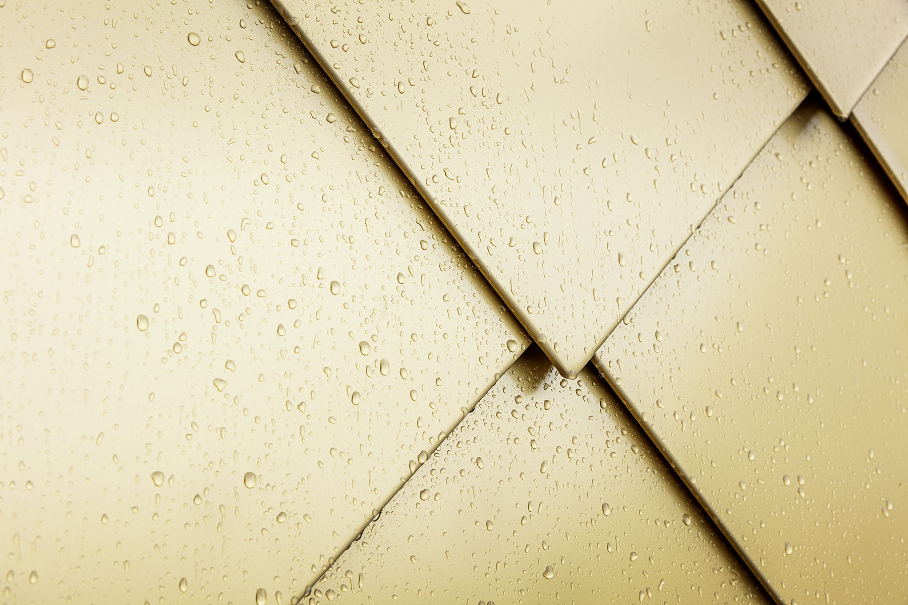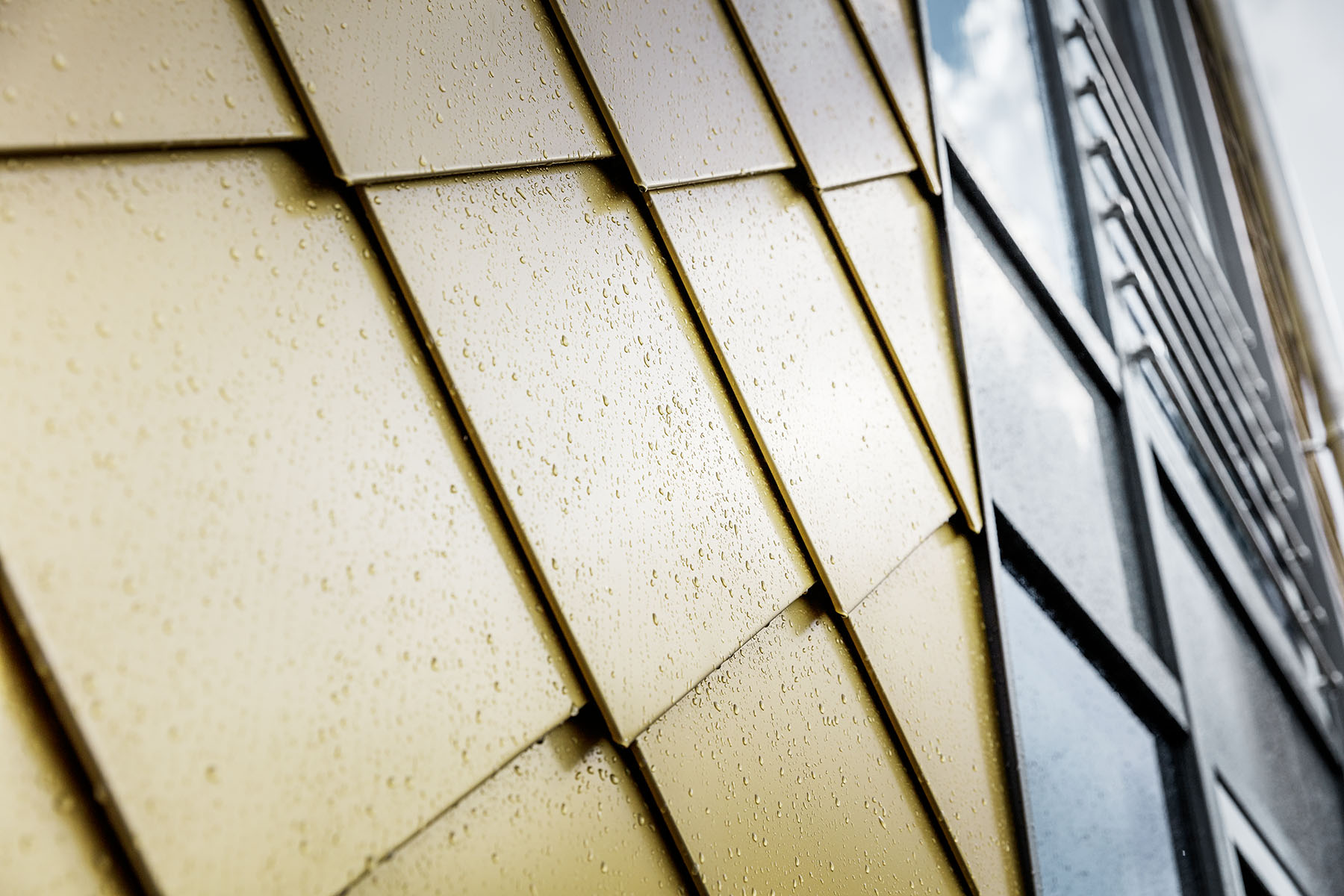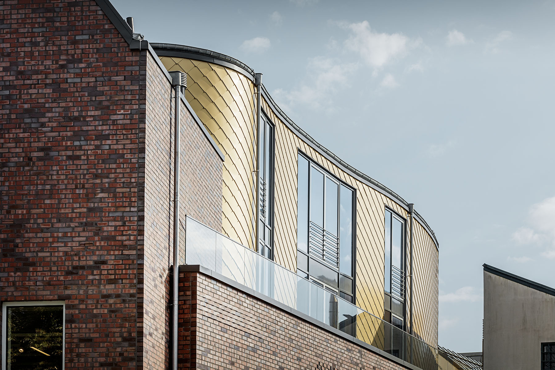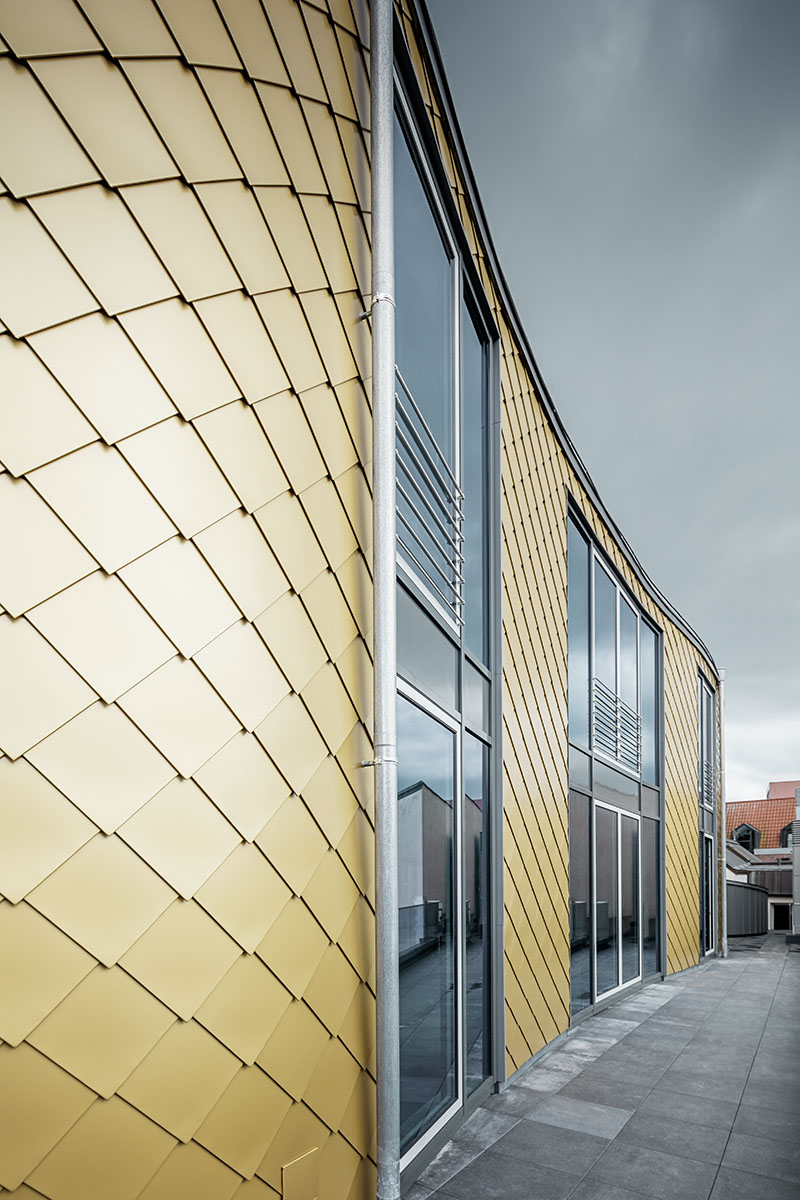Použitím hliníku na střeše a především na fasádě bylo dosaženo toho, že na cihlové spodní části domu vznikl opticky lehký plášť. Tento dojem zesílila dynamicky zaoblená fasáda obložená zlatými hliníkovými šablonami, které jsou pastvou pro oči. Se zlatou barvu jsme počítali v každém případě, a jak tomu chtěla náhoda, na trhu se právě nově objevily šablony v barvě mayské zlato. U sedlové střechy padlo rozhodnutí na krytinu Falzonal se stojatou drážkou. Falzonal je totiž oboustranně strukturovaný a povrchově upravený. Drážková technologie umožnila doslova filigránské, lineární rozdělení střešní plochy. Šáry o šířce 58 centimetrů kombinované s velkorysými vikýři celek výrazně člení.