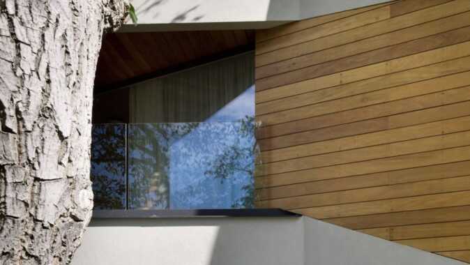 Vltavy. Celoročně vtahuje své obyvatele prosklenými stěnami do okolní přírody. Vzhledem k trojúhelníkovému tvaru parcely a výraznému svahu orientovanému