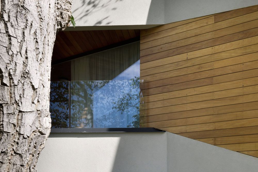 Dům je zalomený do otevřeného L podle tvaru pozemku a sestupuje po svažité zahradě. Intimitě napomáhá množství vzrostlých ořechů a třešní a sevření okolních zahrad. Žádná strana pozemku nenavazuje na komunikaci, přístup k domu je po dlouhé úzké příjezdové cestě, odkrojené od sousedního pozemku. Dům z ulice není vůbec vidět, je schovaný pro dokonalé soukromí, utajeno pohledům zvenčí tak zůstává i jezírko s lekníny.