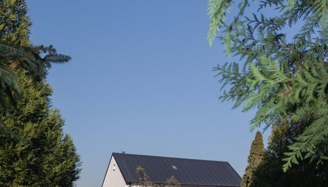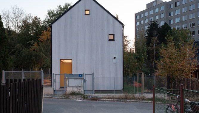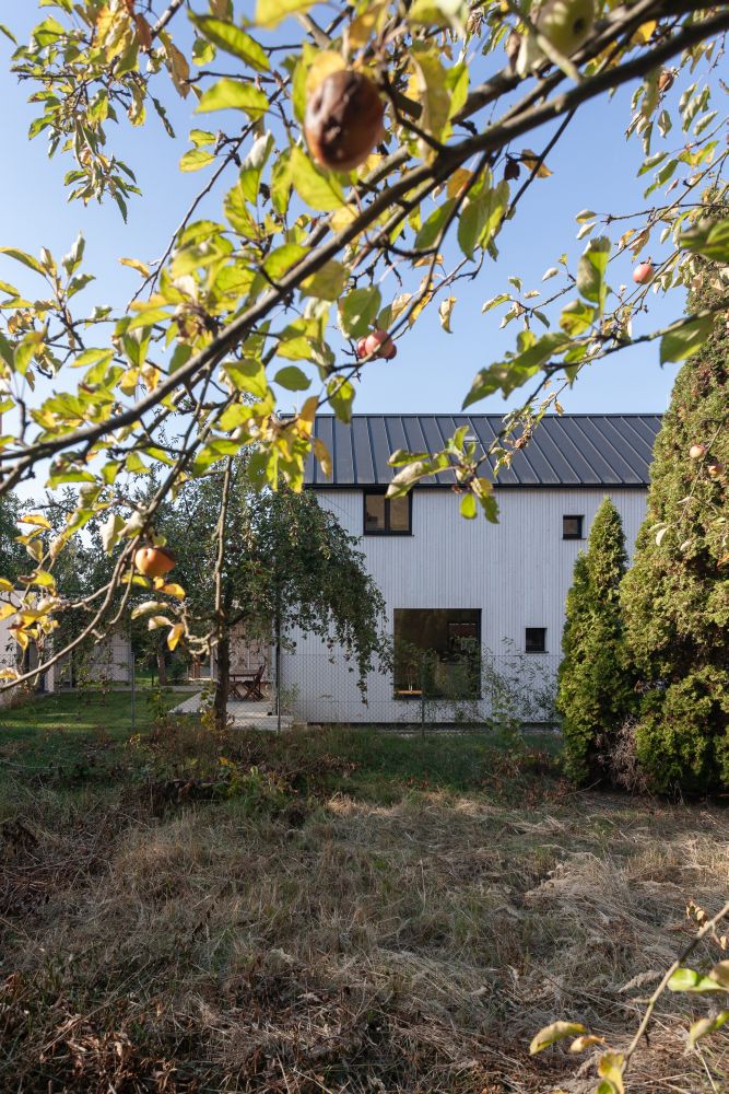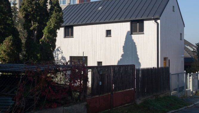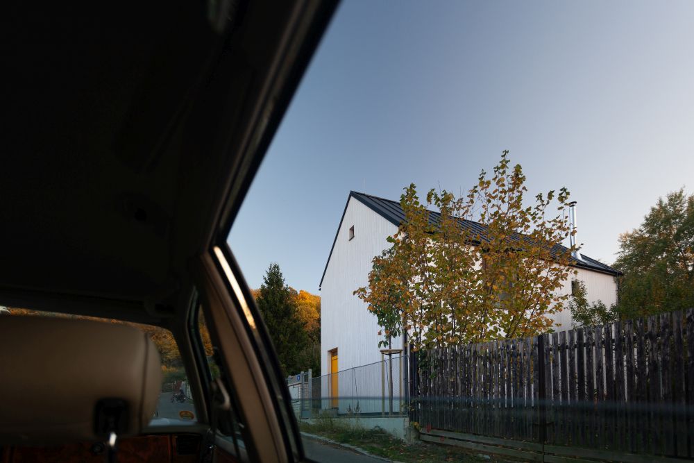 Samotný dům s bílým dřevěným obkladem a sedlovou střechou je otočen k místní komunikaci jednoduchou fasádou s hlavním vstupem. Do zbylých stran jsou propsány tři základní rozměry čtvercových oken tak, aby v každé z místností bylo dostatek světla. Velká fixní, menší otvíravá a nejmenší „střílny“, prosvětlující pobytové platformy v otevřeném krovu.