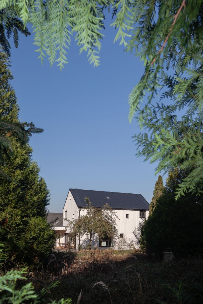 rozdělen na dvě hmoty, rodinný dům a malou pracovnu přes dvůr.
