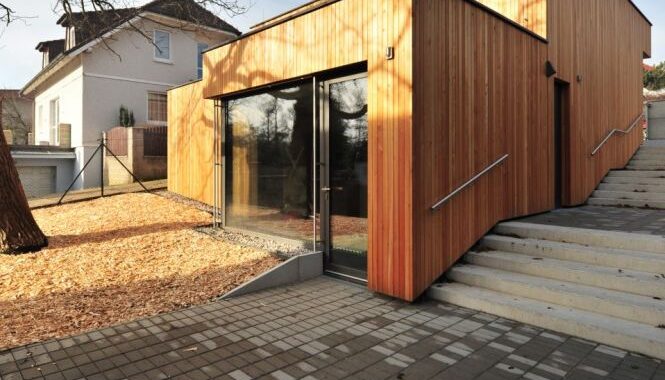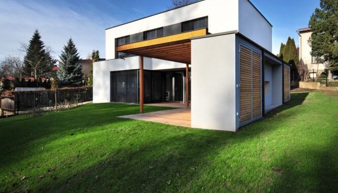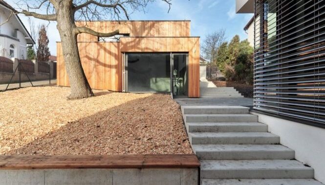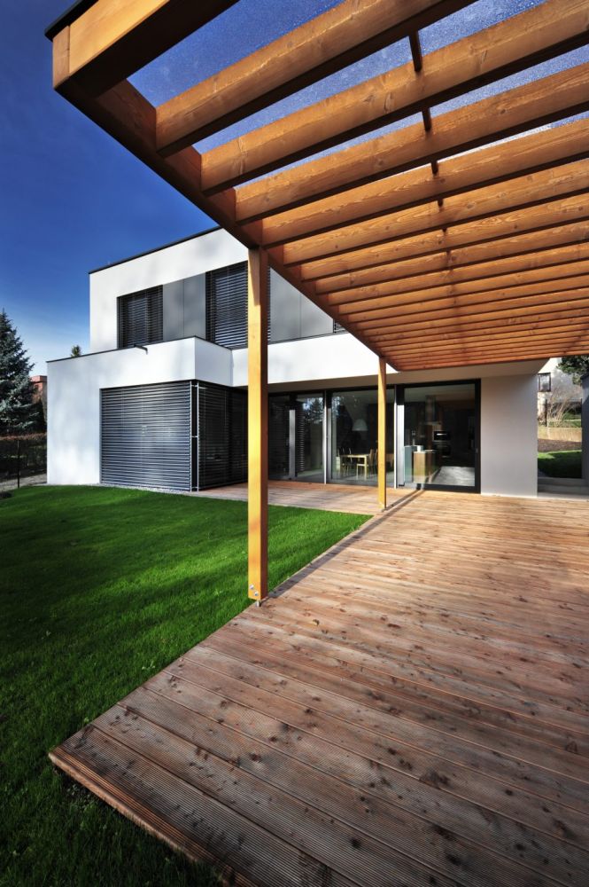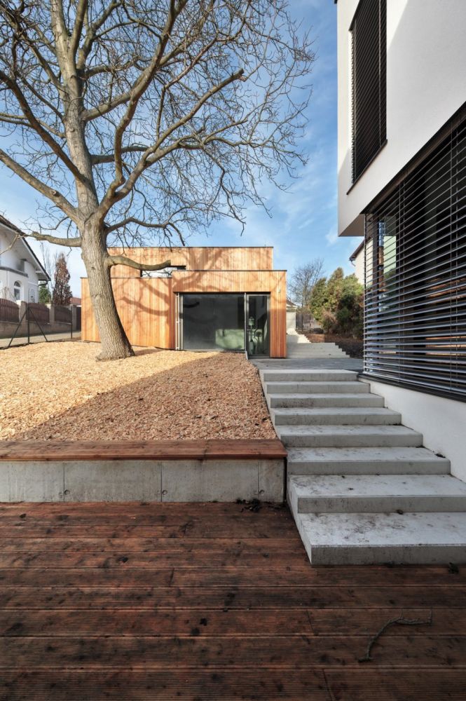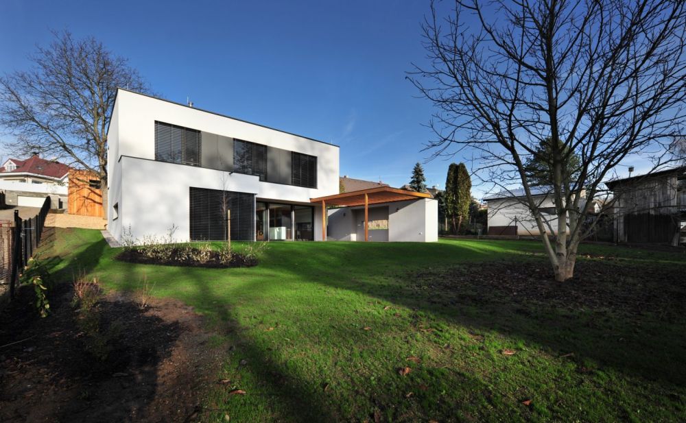 Koncept si sami pro sebe nazýváme obývákem uprostřed zahrady. Dům zahradu rozděluje na jižně orientovanou společenskou část a severně orientovanou klidovou část, které dominuje ořešák. Výškové řešení stavby vychází z konfigurace terénu. Skládá se ze dvou hmot, které kopírují terén a jsou vůči sobě o půl patra posunuté. Od vstupu je možné sejít o půl patra dolů do „společenské“ části nebo vyjít o půl patra nahoru do „soukromé“ části. Dispoziční řešení bylo vedeno snahou vytvořit velkorysé vnitřní prostory a zároveň umožnit variabilitu místností, které nejsou denně využívány. Chtěli jsme navrhnout krásný a funkční dům obklopený přírodou.