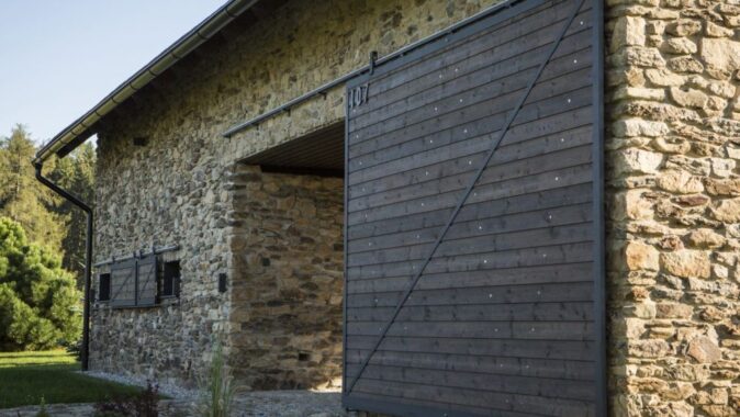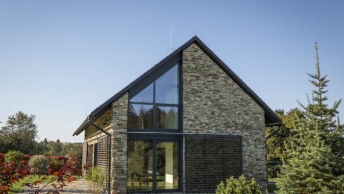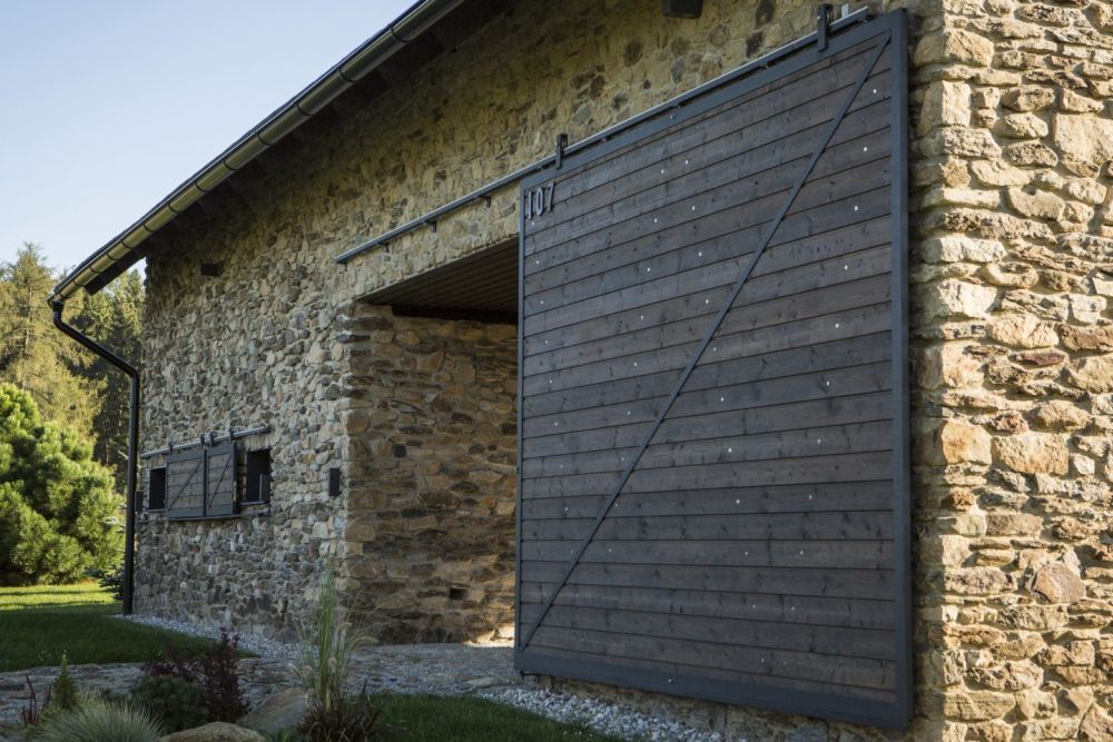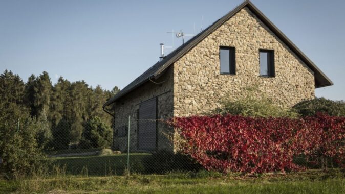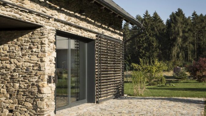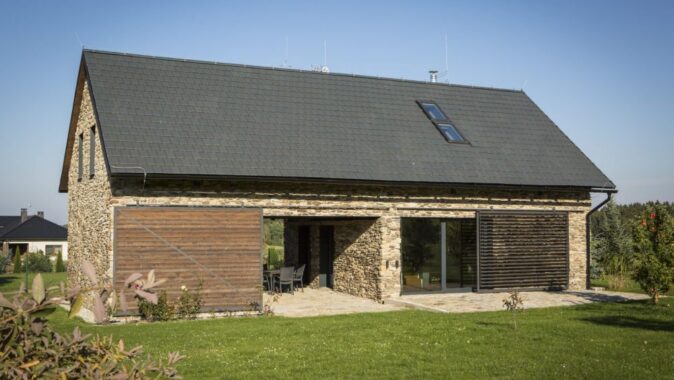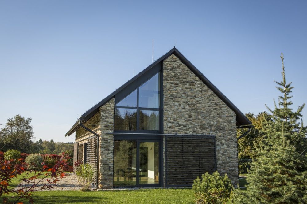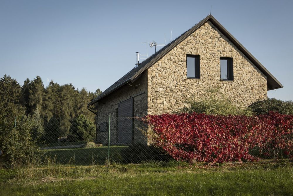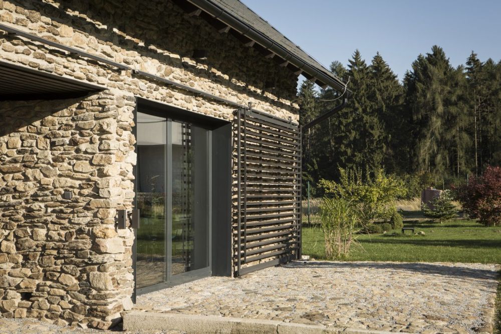 Použili jsme klasické materiály: kámen, sklo, dřevo, černý kov, fasáda je kamenná. Kolem tepelně izolačního keramického zdiva je 180 mm kamenná přizdívka se 40 mm provětrávanou vzduchovou mezerou. Všechen kámen byl použit z okolních polí tak, jako kdysi. Oplechovaná ostění odkazují na současnost.