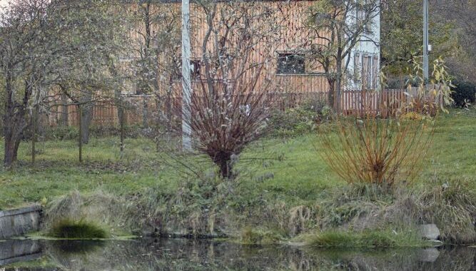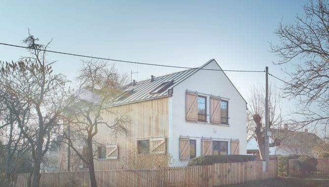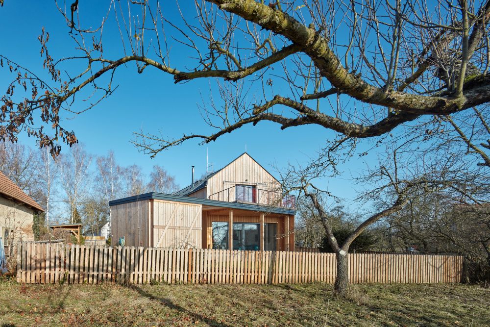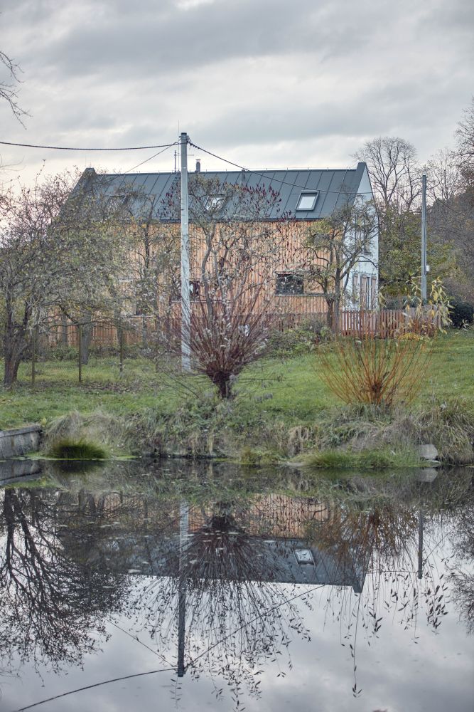 Dům je obklopen zelení a zasazen do tradiční zástavby, vznikl na místě staticky nevyhovující budovy. Štítová stavba na návsi se díky respektu