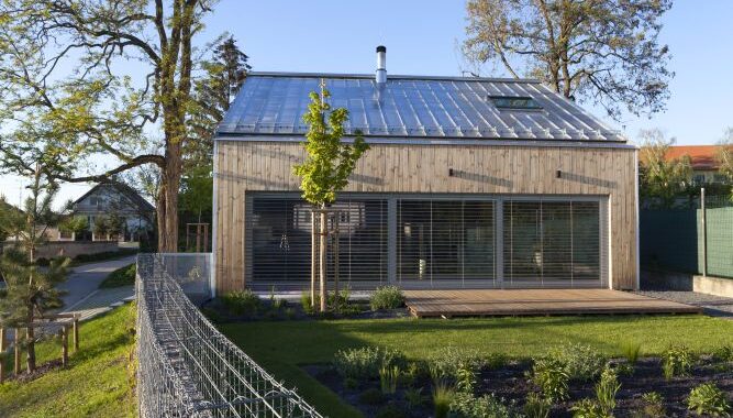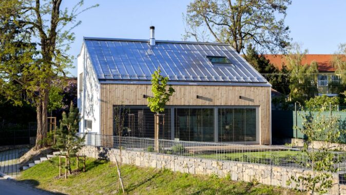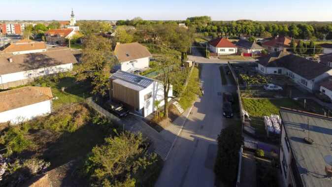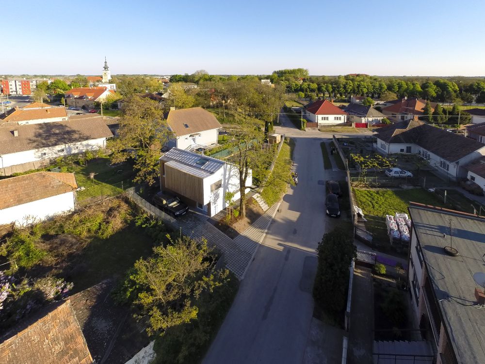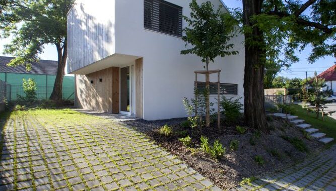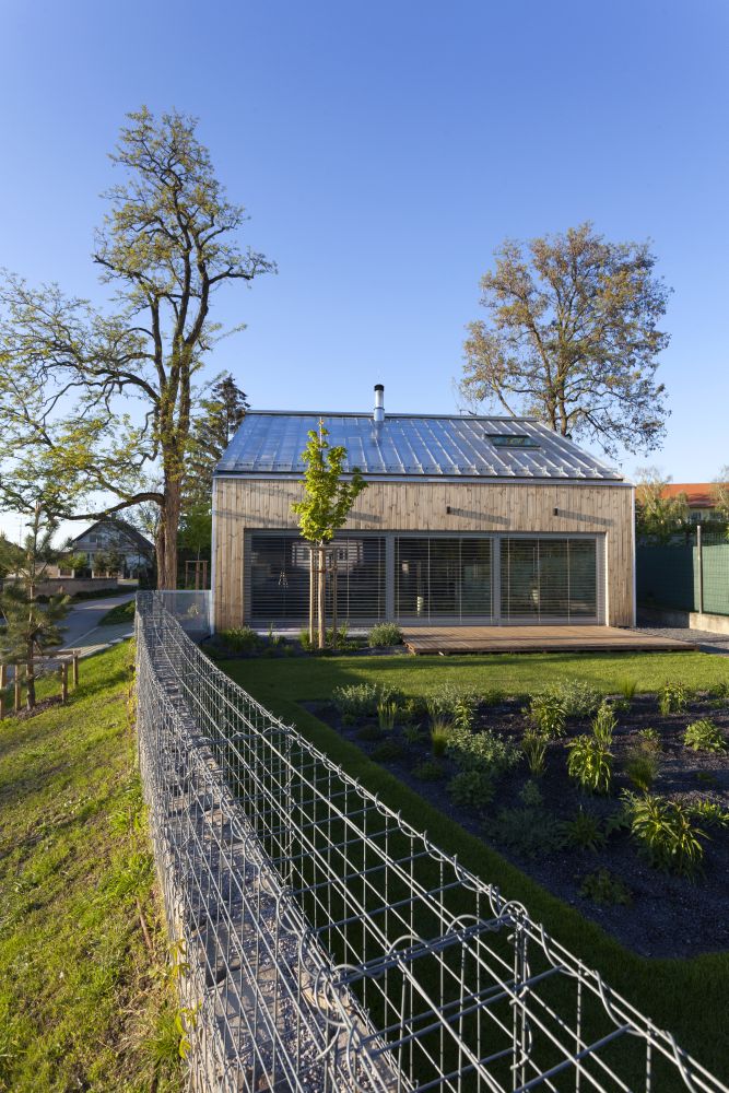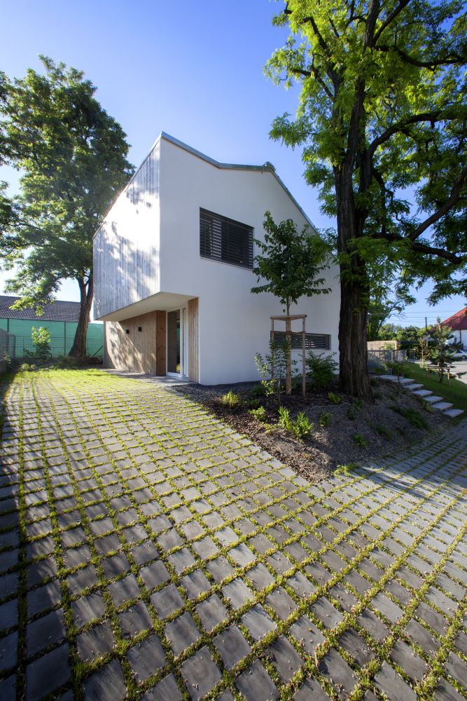 Hmota rodinného domu vychádza z tradičného tvaru domu umiestneného medzi existujúce stromy. Snaha o symbiózu zelene vyústilo do spojenia plochej a šikmej strechy. Dvojpodlažná stavba zámerne rešpektuje uličnú líniu, pričom svojou polohou si otvára výhľad na celý pozemok. Prudšie zvažovanie strechy smerom na juh podporuje ľahkosť záhrady a vytvára jej príjemné pozadie. Ľudská mierka priniesla do záhrady vzdušnosť, naopak objekt ju pri vstupe potláča a pôsobí menej osobne, no stále atraktívne.
