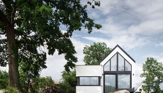sedlovou střechou je ovšem pragmaticky doplněna obdélníkovým kubusem, přičemž