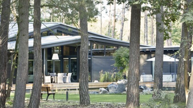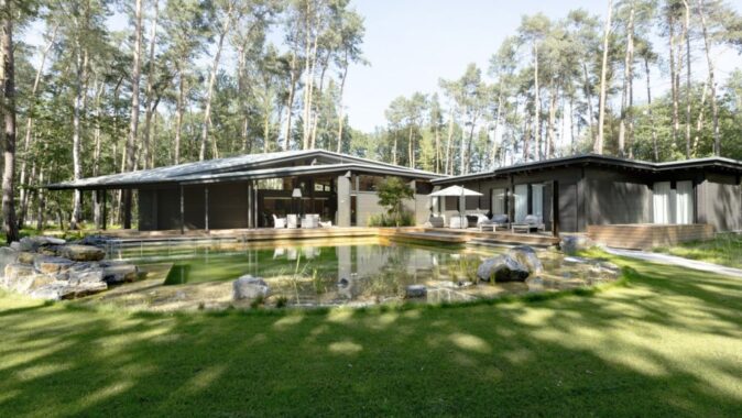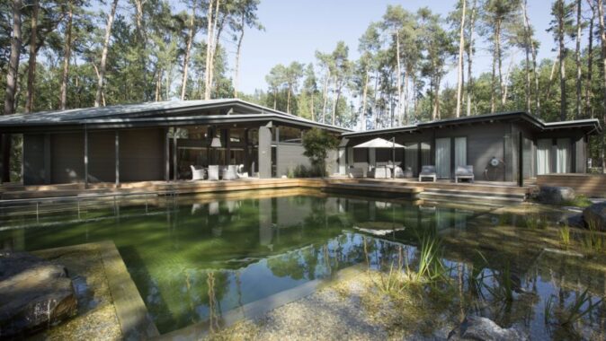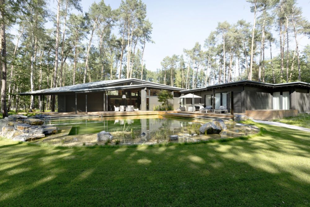 Chtěli jsme zachovat klid a ticho, dosáhnout pocitu soukromí a bezpečí. Dům s jezírkem jsme umístili do středu pozemku, hlavní místnosti jsou kolem vodní plochy. Srub má půdorysný tvar písmene T se třemi křídly rozdílných funkcí a charakterů. Hlavní vstup byl umístěn na křížení těchto částí. V prvním křídle jsou obslužné prostory, druhá část je klidová, třetí aktivní s kuchyní, jídelnou, obývací místností a pracovnou.