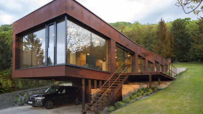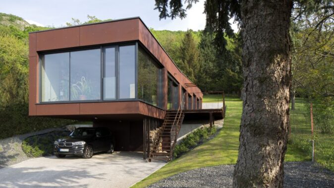 Investorom je jeden z dvojice architektov s rodinou. Úzky svahovitý pozemok sa nachádza priamo pod lesom s výhľadom na Dunaj. Pôdorys domu vychádza z tvaru pozemku.
