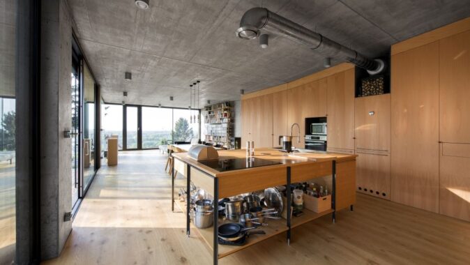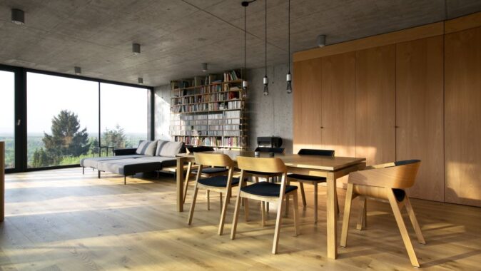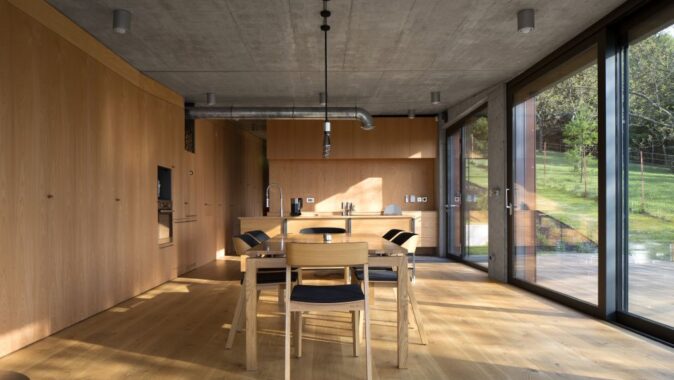 Dispozícia minimalizuje miestnosti na to najnutnejšie: žiadne závetria, zádveria, komory ani šatníky. Iba skriňová chodba otvárajúca sa do pracovne a občasnej hosťovskej izby, dve spálne a kúpeľňa. Denná časť pozostáva so spojeného priestoru obývacej izby, jedálne a kuchyne, vstupuje sa z terasy priamo do kuchyne. A hlavne je všetko spojené so záhradou. Namiesto garáže prístrešok vytvorený vykonzolovaním obývacej izby.
