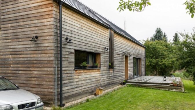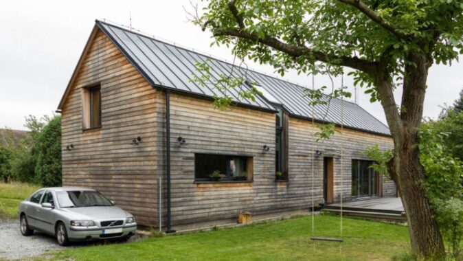 Náš návrh vycházel ze zadání investora: „Chci levný, jednoduchý dům se šikmou střechou pro moji rodinu tak, aby dobře zapadl do vesnické krajiny“. Jako východisko jsme si zvolili vesnickou stodolu, kterých je v okolí několik. Svými proporcemi se nám hodila lépe než klasický dům úzkého dlouhého tvaru. Budovu jsme si rozdělili na dvě části – hlavní obytný prostor na jižní straně a privátní, ložnicový svět s hygienickým zázemím na straně severní. Dům je orientován jihozápadně, ve směru hlavního výhledu z pozemku na okolní krajinu. Svým podlouhlým tvarem tvoří také jakousi bariéru a vymezuje na zahradě určité soukromí.