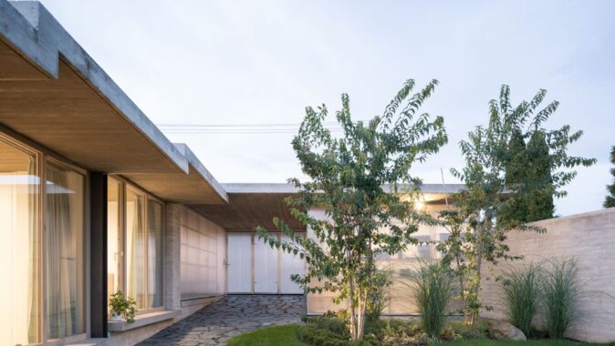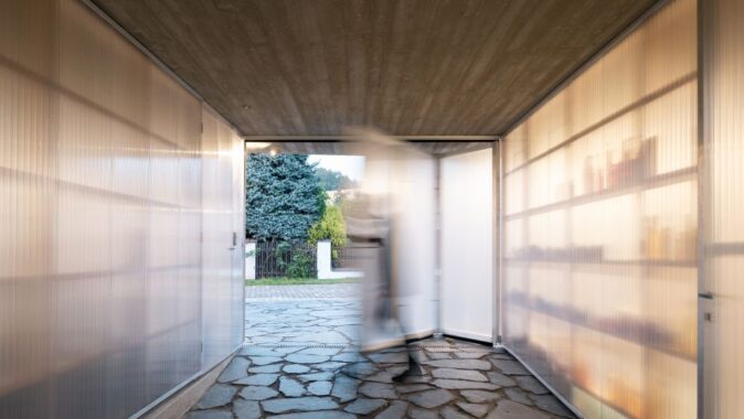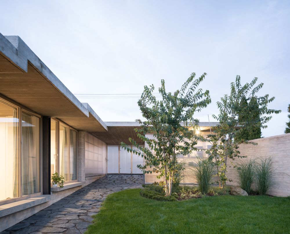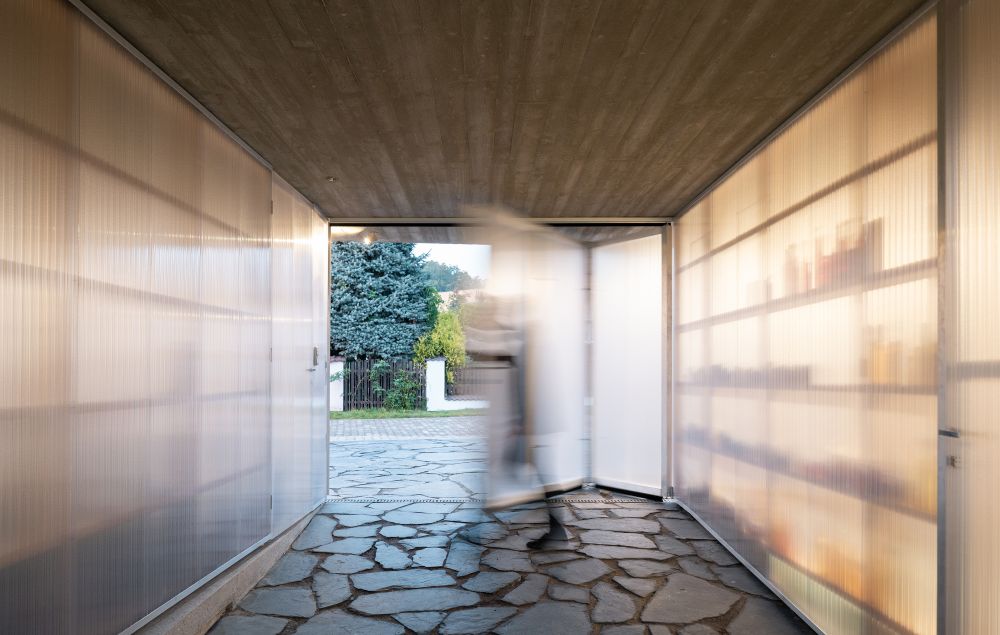 Dům tvoří kaskáda obytných místností a venkovních prostor, jež kopírují terén mírně svažitého pozemku orientovaného na jih. Obytnou část od ulice oddělují průsvitné polykarbonátové objemy garáže a zahradního skladu. Mezi nimi projdeme pod betonovými přesahy střechy do atria. Život se odehrává kolem atria a zahrady, odkud se vstupuje do domu. Mezi atriem a jižní zahradou je hlavní obytný prostor, kde se vaří a odpočívá. V létě je možné jej otevřít na severní i jižní stranu, takže propojuje obě zahrady.