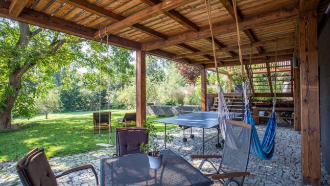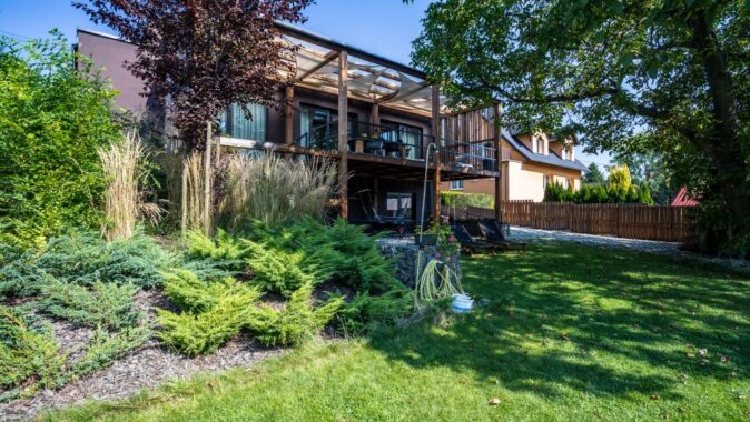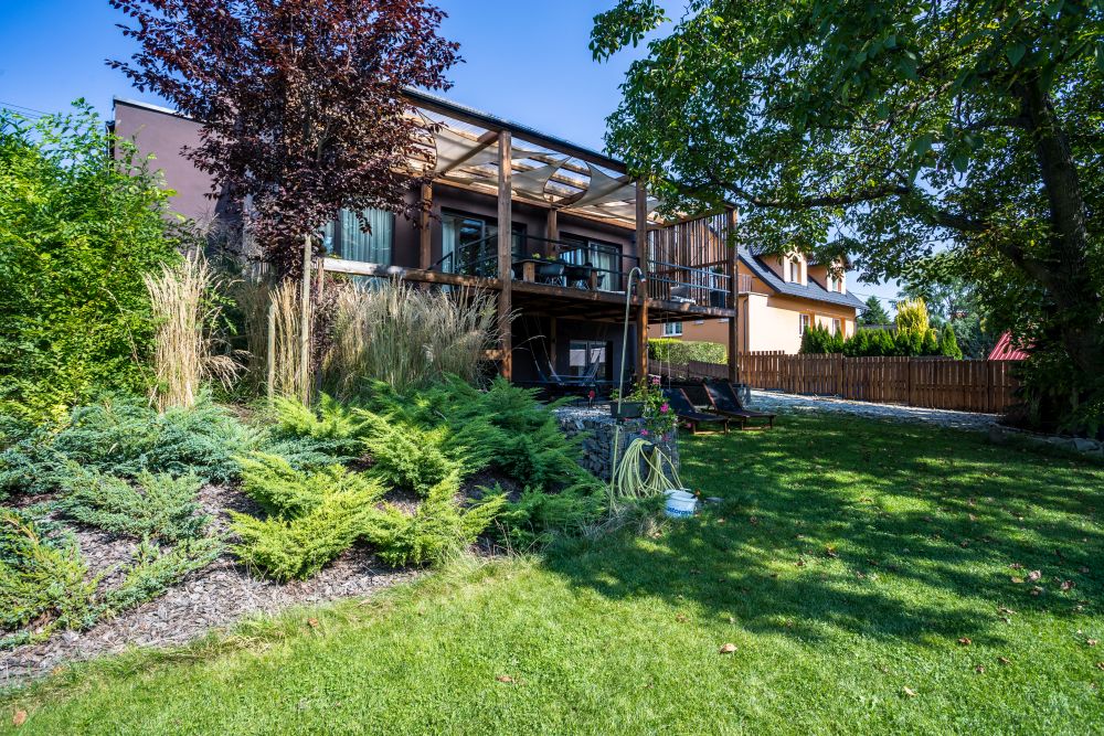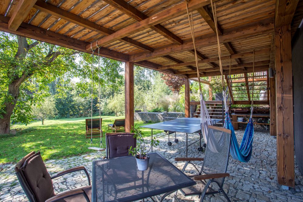 několik starých jabloní a zelený protilehlý svah zarostlý keři. Pro rodinu s dětmi