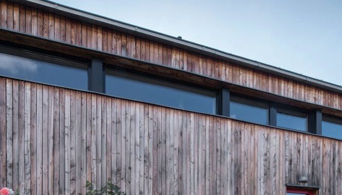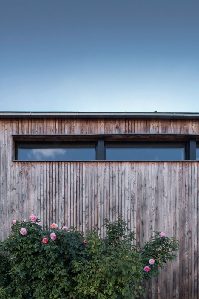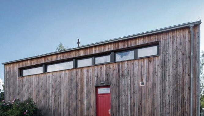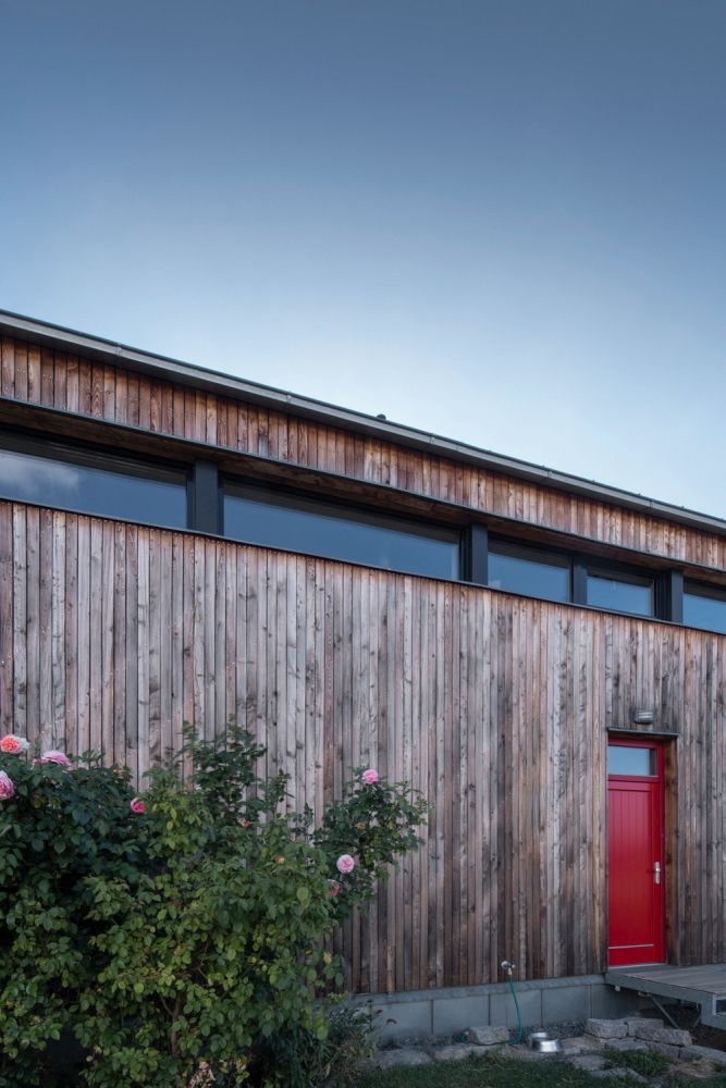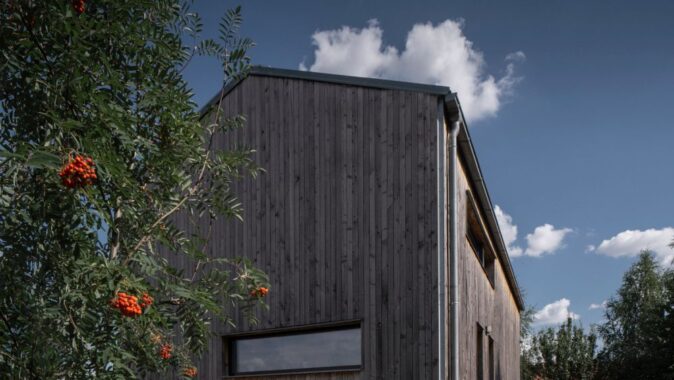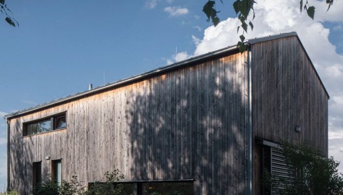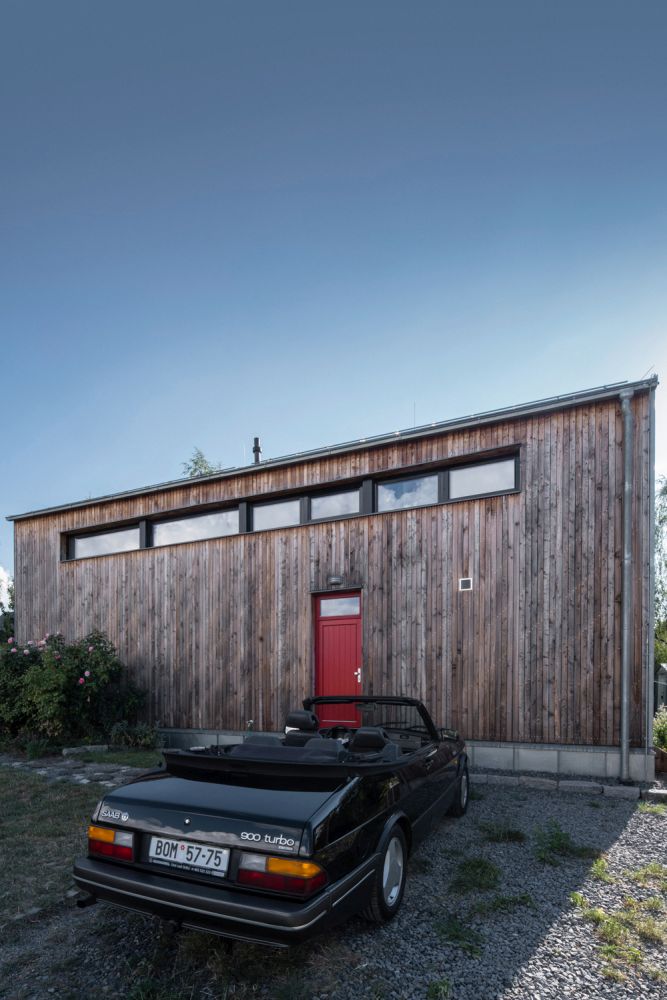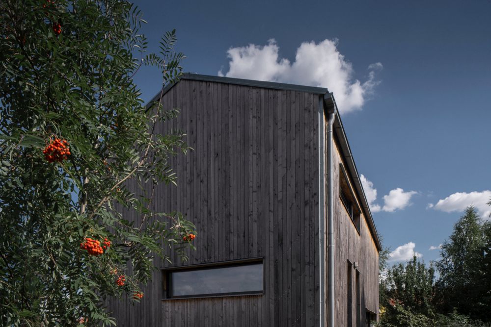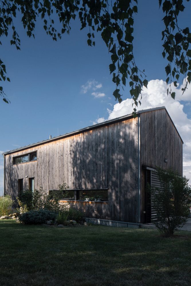 Dům jsme koncipovali tak, aby jeho velikost, celková proporce, ale i rozměry okenních a dveřních otvorů byly v souladu s řádem dřevěné konstrukce. Pro zjemnění výrazu domu a jeho přirozenému začlenění do kontextu vzrůstajících bříz byla zvolena dřevěná fasáda. Výrazným prvkem jižní fasády je posuvný stínící panel, který se uplatní nejen jako plně funkční prvek, ale dotváří i celkový výraz domu.