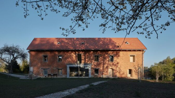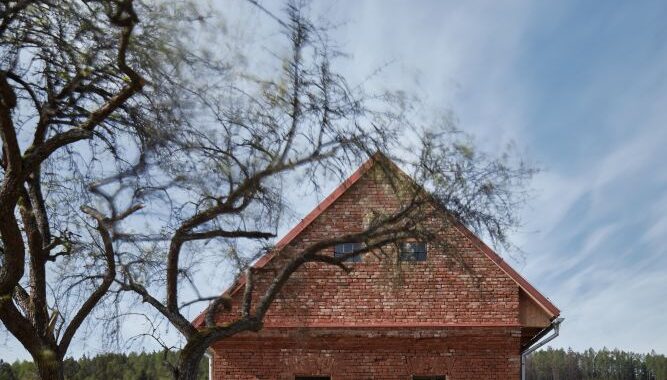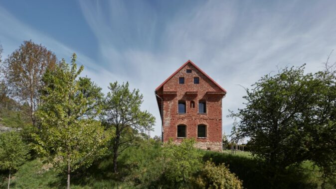 Ani takhle osekaný dům, dá se říci abstrahovaný, neztratil nic ze své velkoleposti. Právě naopak. Způsob, jak je situovaný, jak se vzpíná k nebi a jak jeho syrová hmota odolává času, se ukázaly jako největší kvality. Byla to ruina ohlodaná až na kost. Z původní usedlosti zbyla jen cihelná obálka se střechou. Společně se stavebníky jsme si kladli otázku, zda se máme kam vracet. Při jakékoliv snaze o tradiční opravu bychom o tenhle charakter ruiny přišli. Relativně brzy jsme proto zavrhli spekulativní rekonstrukci původního stavu, i jakékoliv další imitace. Navrhli jsme zafixovat stávající stav romantické ruiny a vstoupit do domu nově.