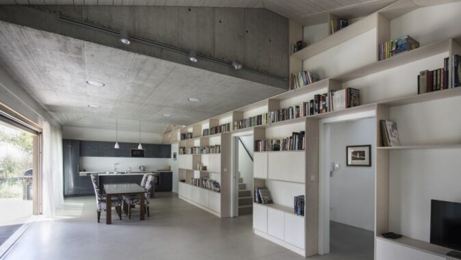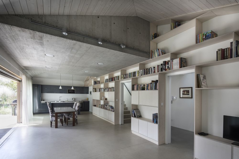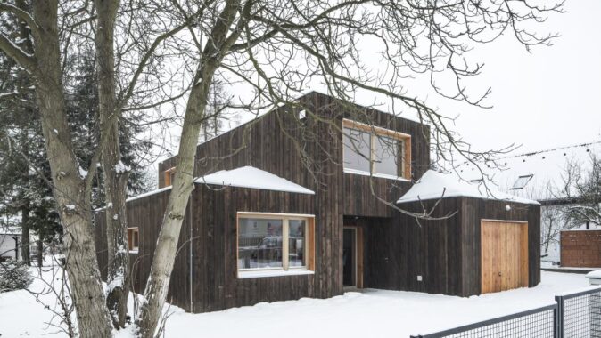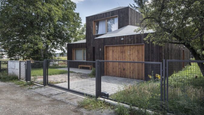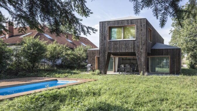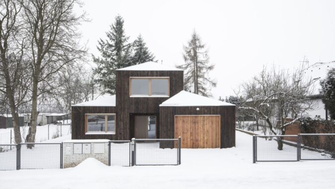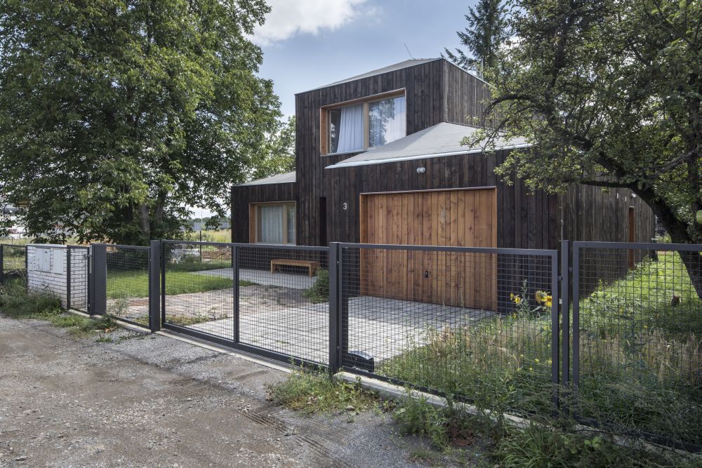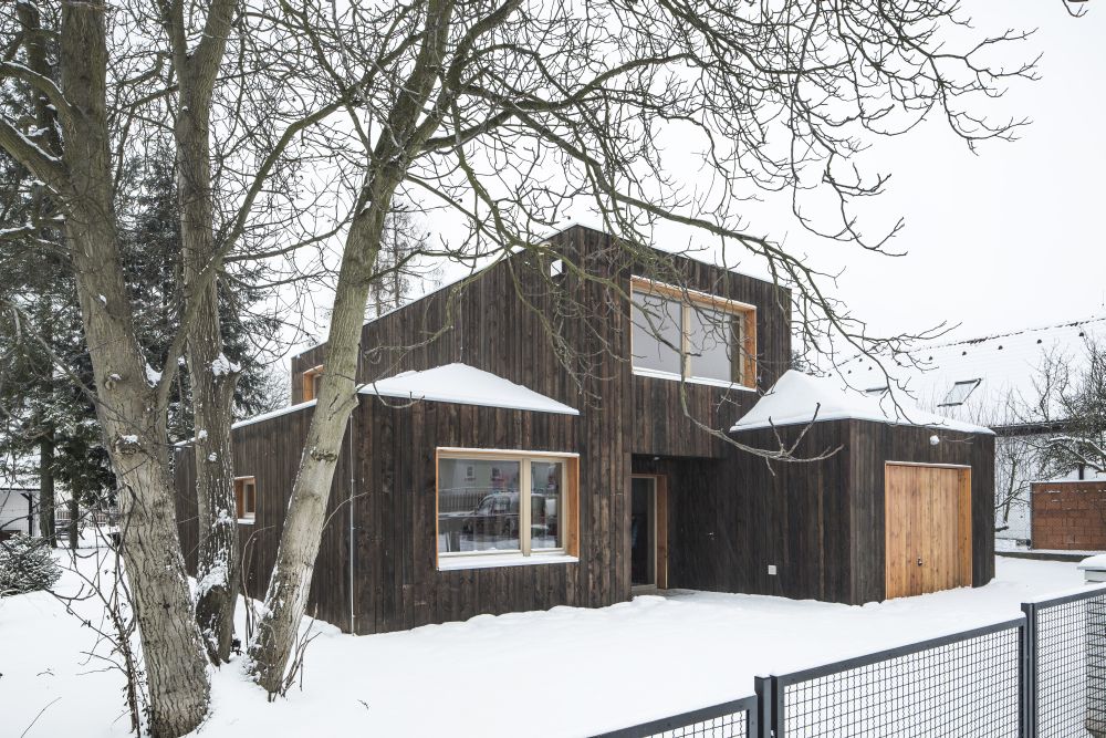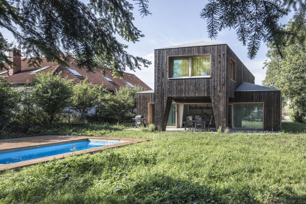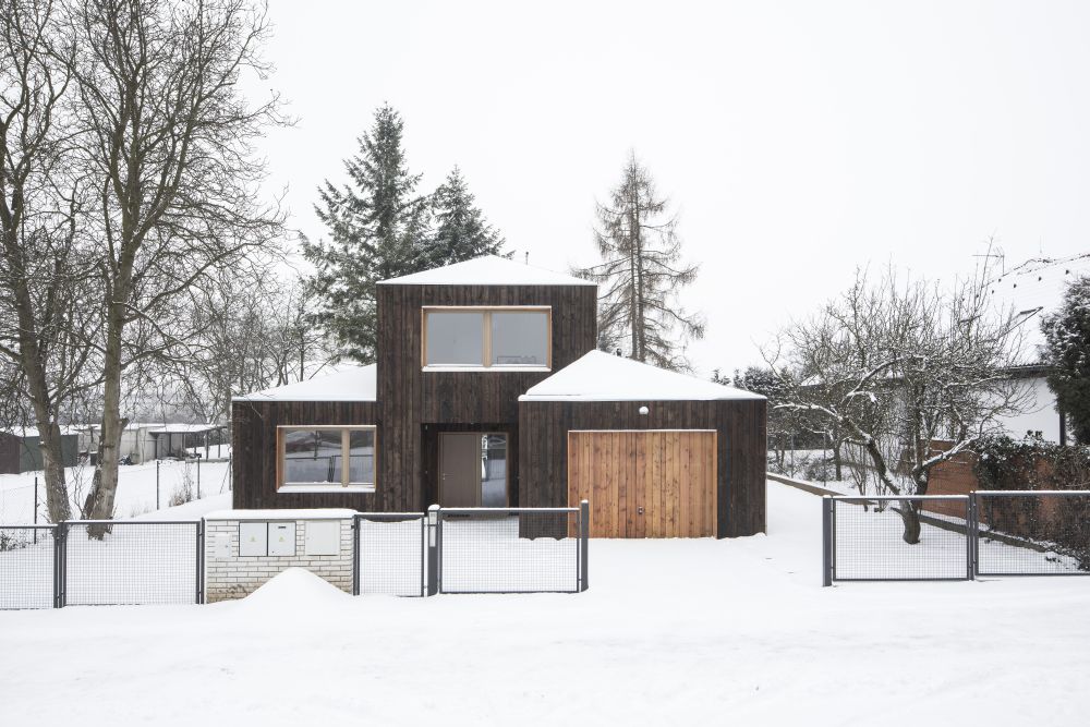 Dům pro čtyřčlennou rodinu stojí v bývalé zahrádkářské kolonii, která je malou oázou zeleně na průmyslové periferii Prahy. Projekt se musel vypořádat s podmínkami už vydaného územního rozhodnutí na jiný dům. Nepravidelný pravoúhlý půdorys a šikmé střechy byly předepsány. Hmotové řešení domu vychází nejen z předepsaného tvaru, ale i ze snahy zachovat drobnější měřítko bývalé zahrádkářské kolonie. Aby bylo dosaženo většího soukromí, ustupuje hmota domu v místě oken obytných místností. Na jižní straně se obývací pokoj v přízemí otevírá velikými posuvnými okny do zahrady. Přesahující horní podlaží zde vytváří krytou verandu. Dům je uvnitř zděný, s dřevěnými stropy a betonovou podlahou. Fasáda je obložena pláštěm z dřevěných prken s přírodním pigmentovaným povrchem.