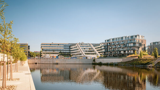 je součástí čtvrti DOCK vyrůstající kolem dvou slepých ramen Vltavy v pražské