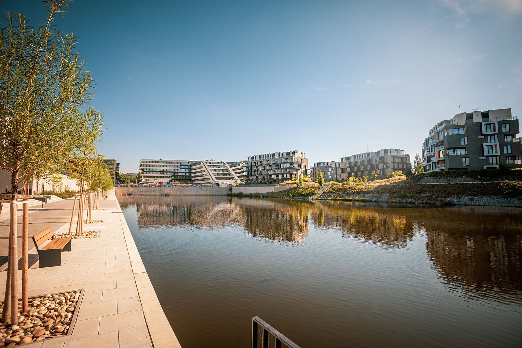 je součástí čtvrti DOCK vyrůstající kolem dvou slepých ramen Vltavy v pražské