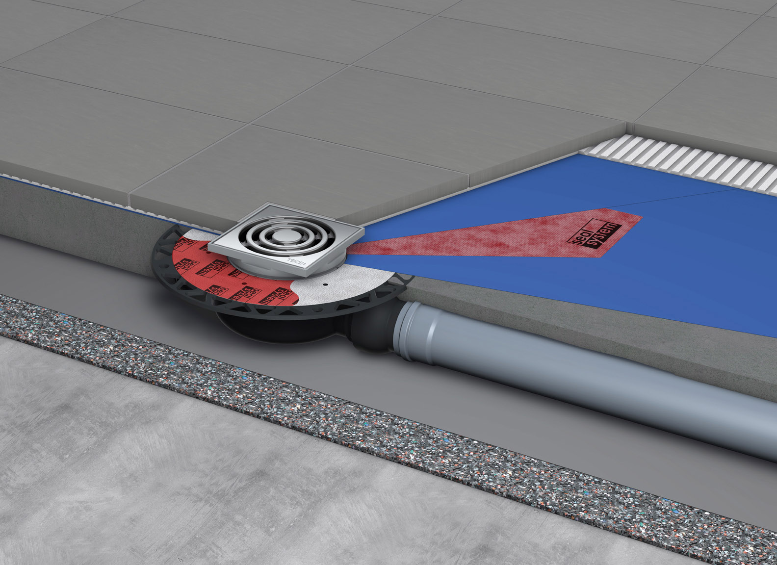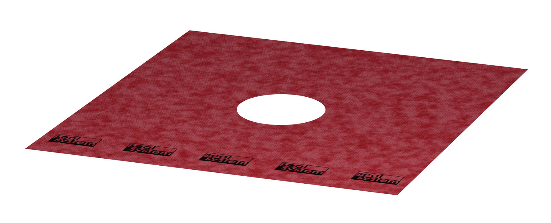 Napojení podlahové vpusti na hydroizolaci provedete za pomoci speciální těsnící manžety Seal System vyrobené z PE se speciálním oboustranným kašírováním z PP. Na připravenou betonovou stěrku aplikujte první vrstvu tekuté hydroizolační stěrky, opět po celé ploše podlahy a také stěn, a to včetně rohových těsnících tkanin. Stěrku je nutno aplikovat i na přírubu podlahové vpusti. Dokud je stěrka ještě vlhká, převlečte těsnící manžetu Seal System přes podlahovou vpusť a přitiskněte na hydroizolaci. Dojde tak k dokonalému propojení obou těsnících prvků. Po zaschnutí první hydroizolační vrstvy aplikujte druhý hydroizolační nátěr a izolace je dokončena.