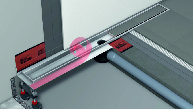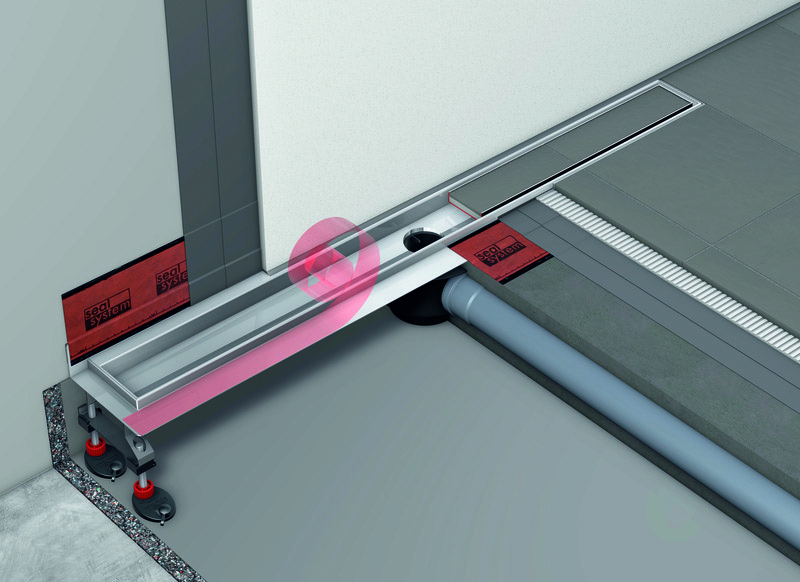 Díky těsnění Seal System nabízí TECE instalatérům a obkladačům spolehlivé a certifikované napojení podlahových vpustí TECEdrainpoint S a žlábků TECEdrainline na hydroizolační stěrky. Butylová těsnící páska se lepí na připravenou betonovou stěrku nebo stěnu a přírubu sprchového žlabu. Přesah pásky na každé straně by měl být cca 10 cm od okraje příruby. Páska je samolepící, snadno tedy přilne