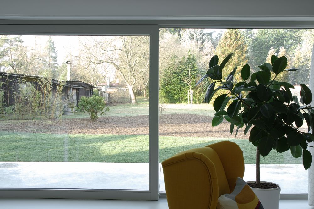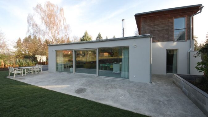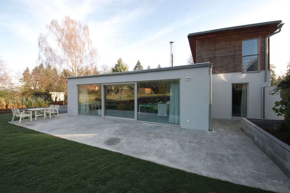 Západo-východní orientace přístavby s velkými okenními tabulemi dodalo interiérům světlo, vzdušnost a propojení se zahradou. Změnou dispozice v chatě vznikla další koupelna, wc, chodba a dva neprůchozí světlé pokoje s výstupem na terasu, která vznikla na střeše přístavby.