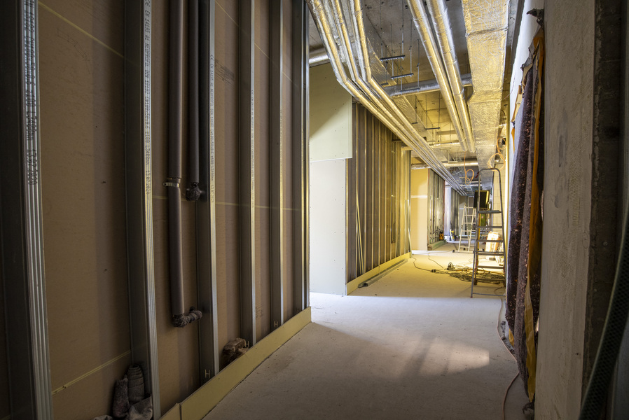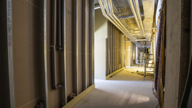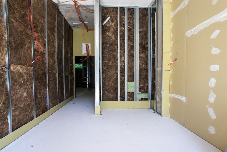 Po likvidaci původního uspořádání a vybourání všech příček se ukázalo, že bude potřeba realizovat zejména u obvodových monolitických stěn sádrokartonové předsazené stěny v konstrukci W 623 a 625. Většina z nich je kvůli místu upevněna přímo na CD profily. Předsazená stěna má uvnitř izolační vatu tloušťky 5 cm, která pomáhá tepelné izolaci objektu. Pro doplnění – venkovní zateplení bude realizováno až po dokončení celkové rekonstrukce objektu. I předsazené stěny jsou dvojitě zaklopené deskami TOPAS. V některých případech předsazené stěny ukrývají potřebnou moderní technologii a instalace, ale tam už jsou vzhledem k prostoru použity CW profily. Podlaha v objektu je betonová. V sádrokartonových konstrukcích je nakonec jedna výjimka, totiž v designových podhledech (například na chodbě), kde TOPAS nahradila klasická deska Knauf White.