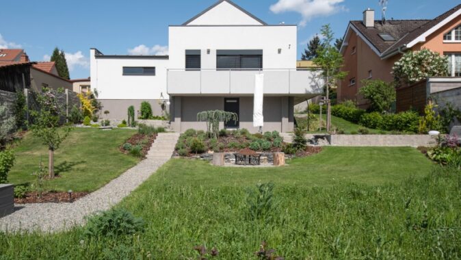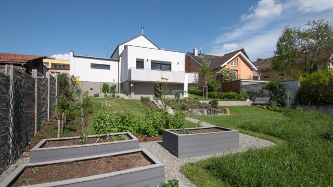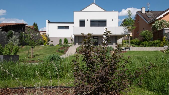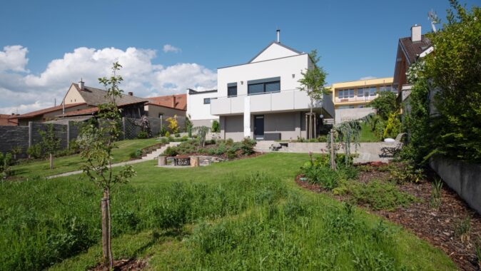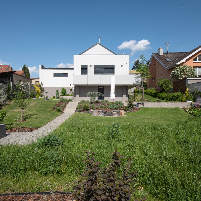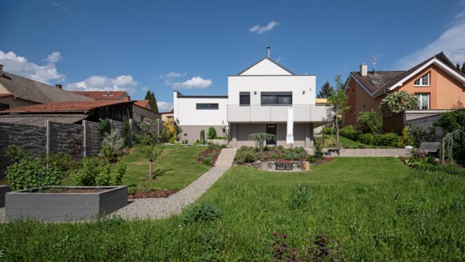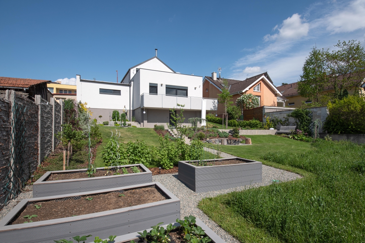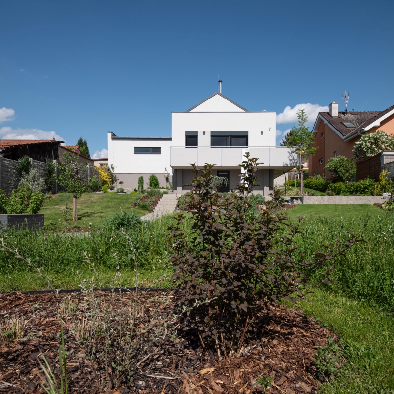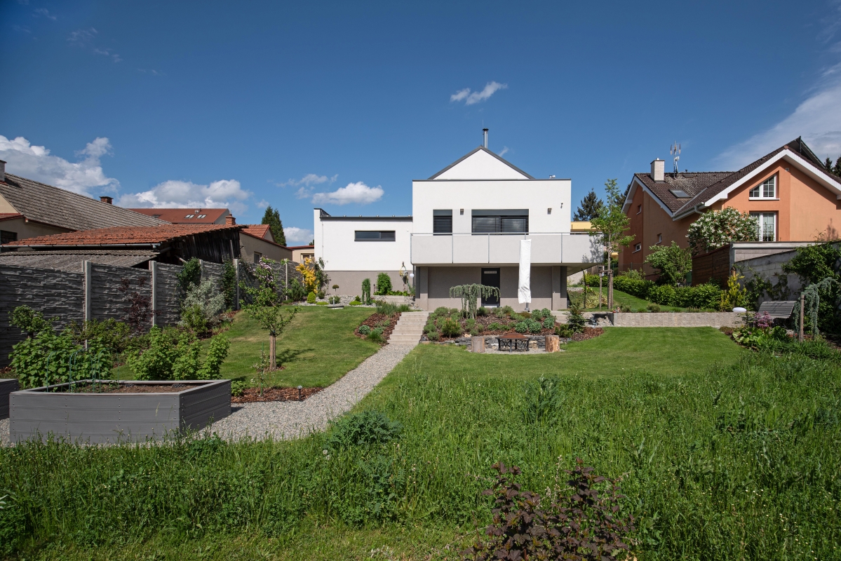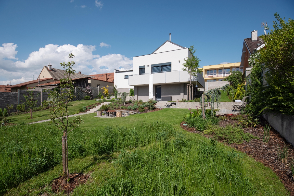 různých hmot. Jednoduchý bílý styl domu jsme v interiéru změkčili použitím
