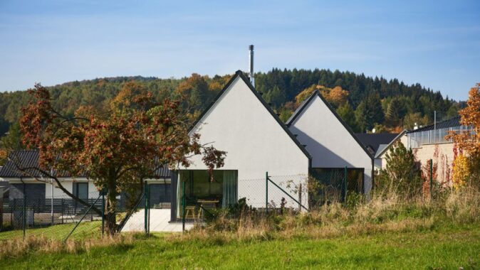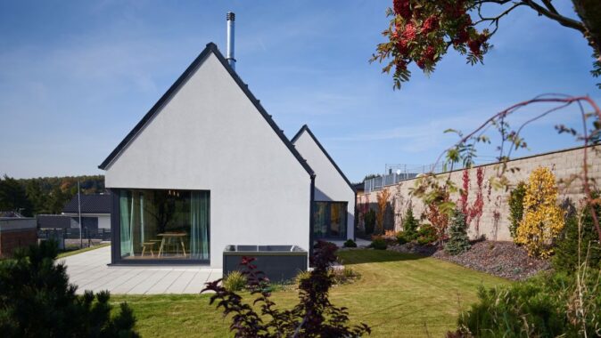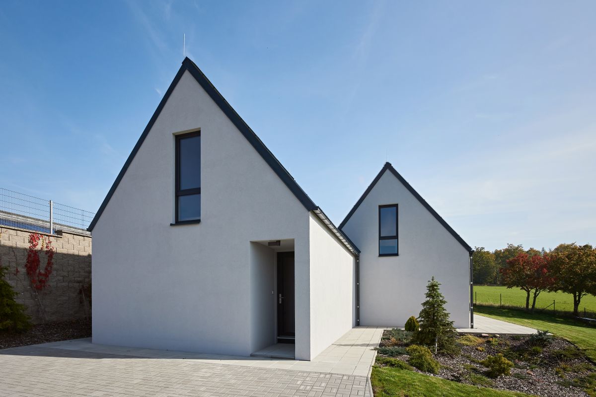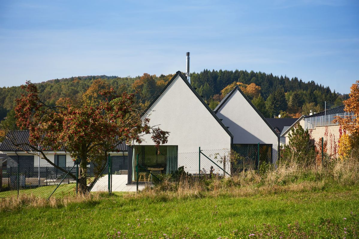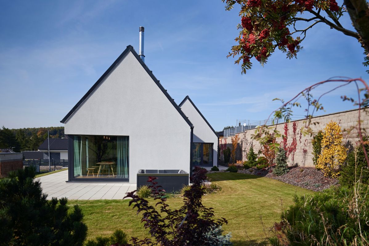 druhá, posunutá více do zahrady, je ryze obytná o dispozici 4+kk, se dvěma