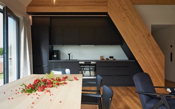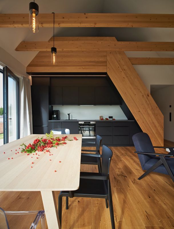 pokoji a převýšeným obytným prostorem otevřeným do krovu, kde je vložena spací