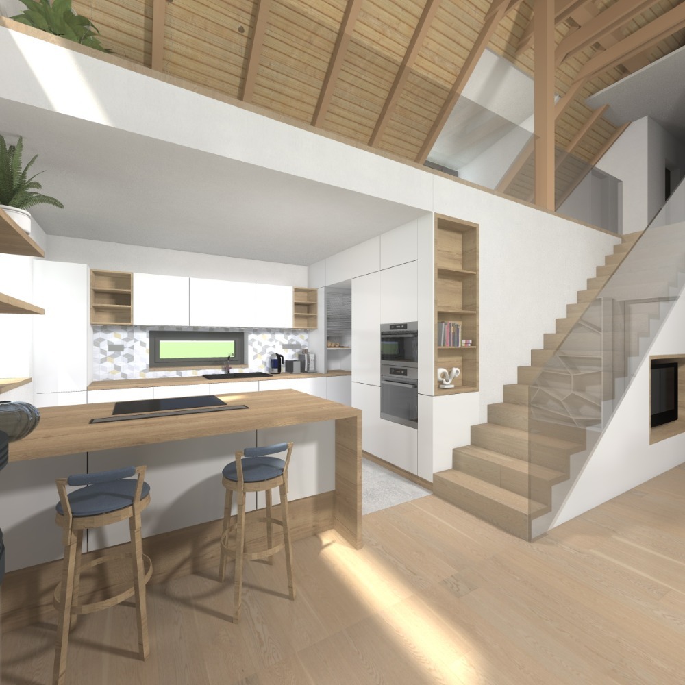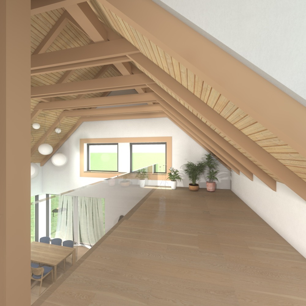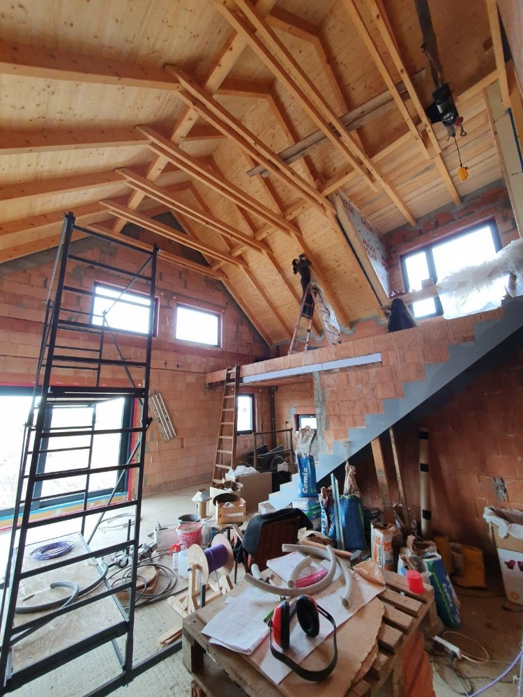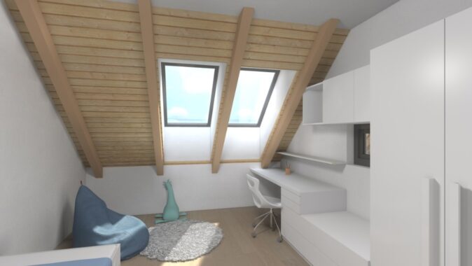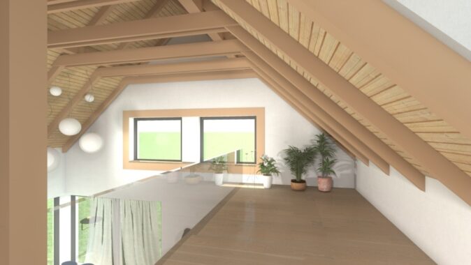 Celý prostor bude navíc působivě otevřen do hřebene střechy s palubkovým obložením na vnitřní straně. „Říkám tomu katedrála, takto si to vymyslela dcera,“ pokračuje Jaroslav Praveček. Prostorné přízemí ještě pojme pracovnu, ložnici s vlastní koupelnou a samostatnou toaletu. Do patra vede schodiště a navrženy tu jsou dva pokoje, koupelna, šatna a otevřená galerie s průhledem do přízemí.