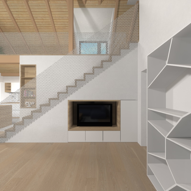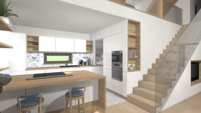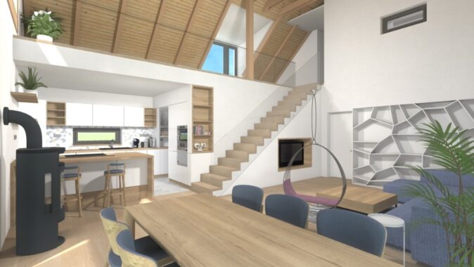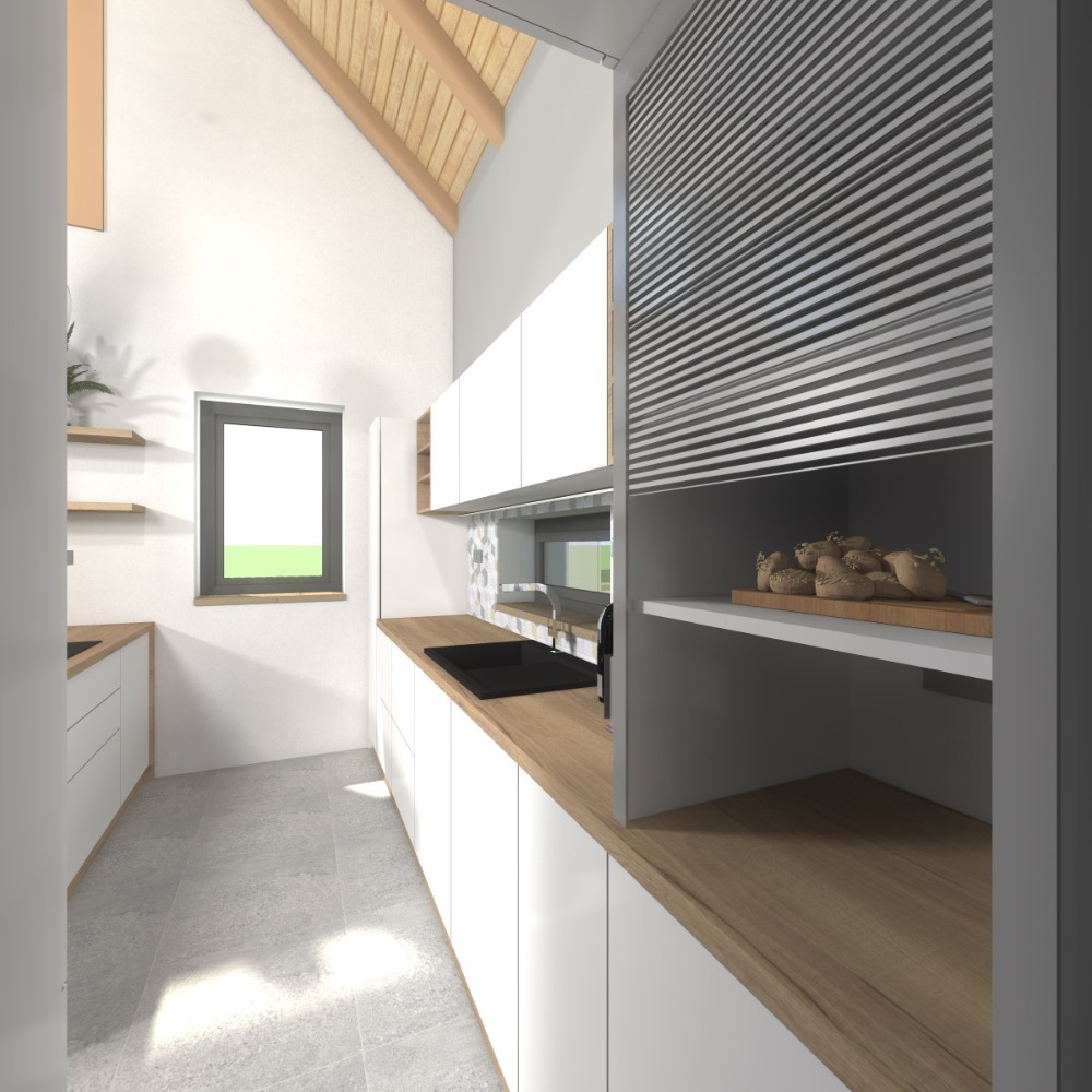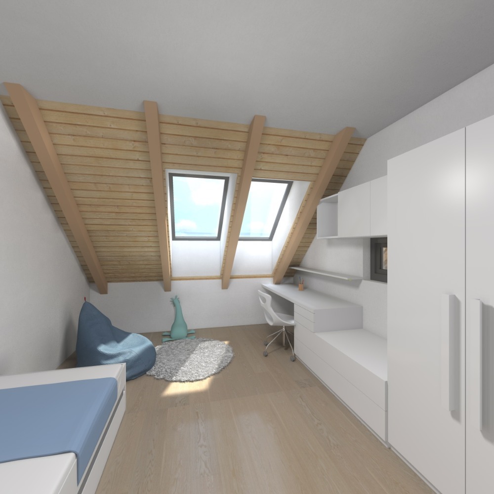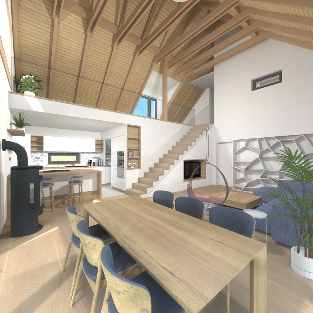 Celý prostor bude navíc působivě otevřen do hřebene střechy s palubkovým obložením na vnitřní straně. „Říkám tomu katedrála, takto si to vymyslela dcera,“ pokračuje Jaroslav Praveček. Prostorné přízemí ještě pojme pracovnu, ložnici s vlastní koupelnou a samostatnou toaletu. Do patra vede schodiště a navrženy tu jsou dva pokoje, koupelna, šatna a otevřená galerie s průhledem do přízemí.